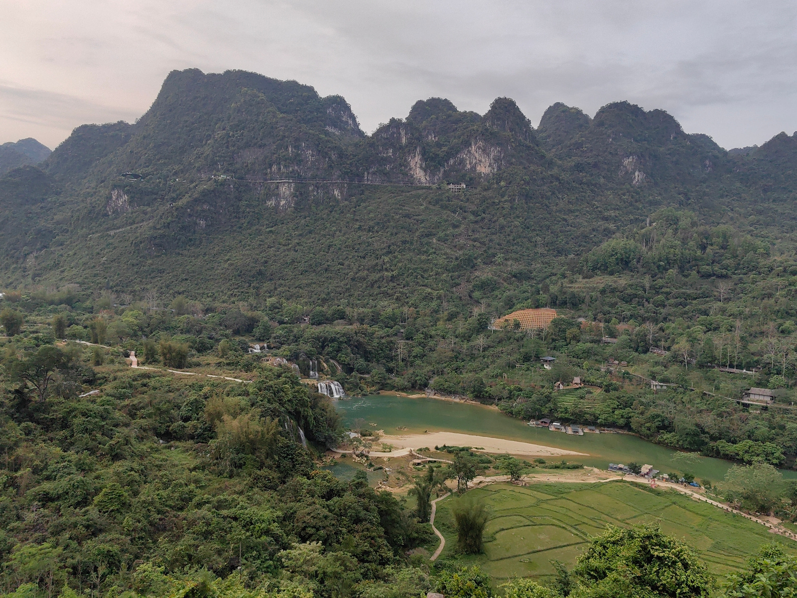 This wide-angle shot shows the Ban Gioc-Detian Falls, in Daxin County, China. Mountains, densely covered with green foliage, form a backdrop. A road winds along the side of the mountains. In the foreg…read more
