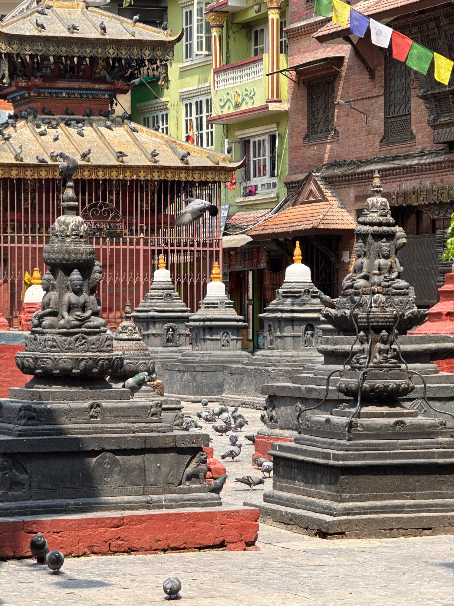 This image depicts a staircase leading to a temple or religious site in Kathmandu Metropolitan City, Nepal. The staircase is made of gray stone, and several pigeons are perched on its steps and on nea…read more