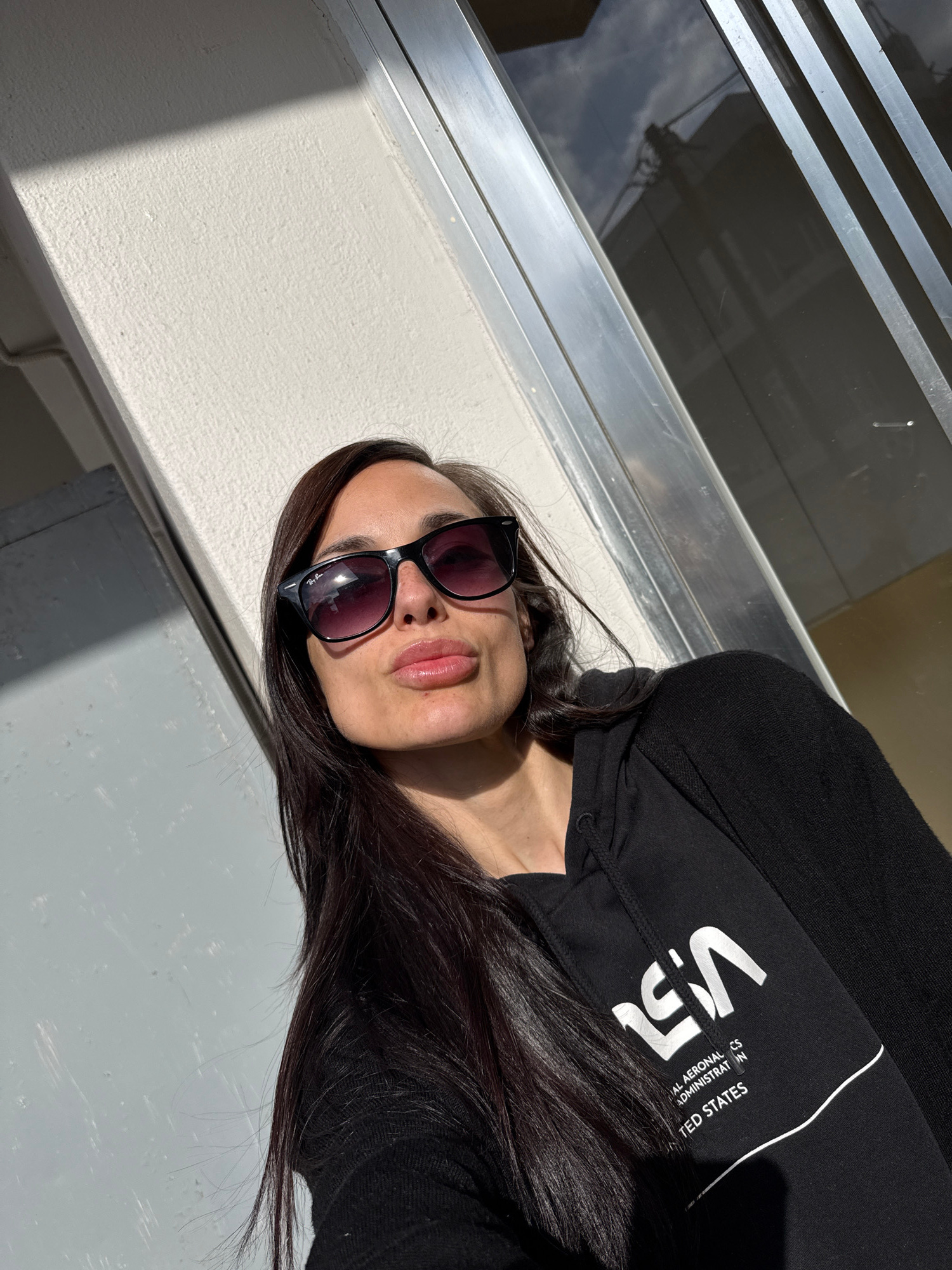 The image shows a woman wearing a black NASA hoodie and sunglasses. She is likely outside on a sunny day, based on the lighting and shadows. A window with metal frames is visible. The location appears…read more