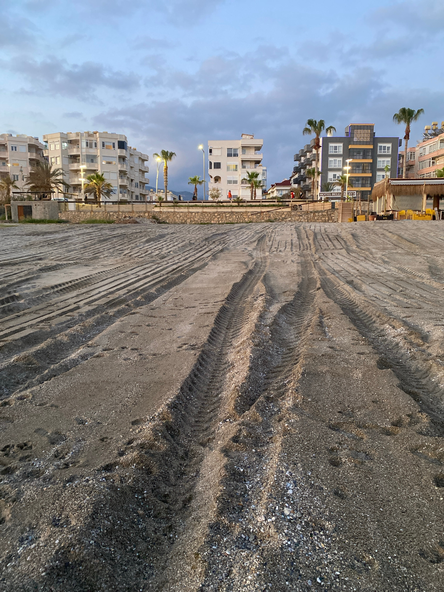 The scene is a beach in Alanya, Turkey, likely cleaned and groomed with a machine. There are multiple tire tracks in the sand, running parallel along the length of the beach. The sand is dark, granula…read more