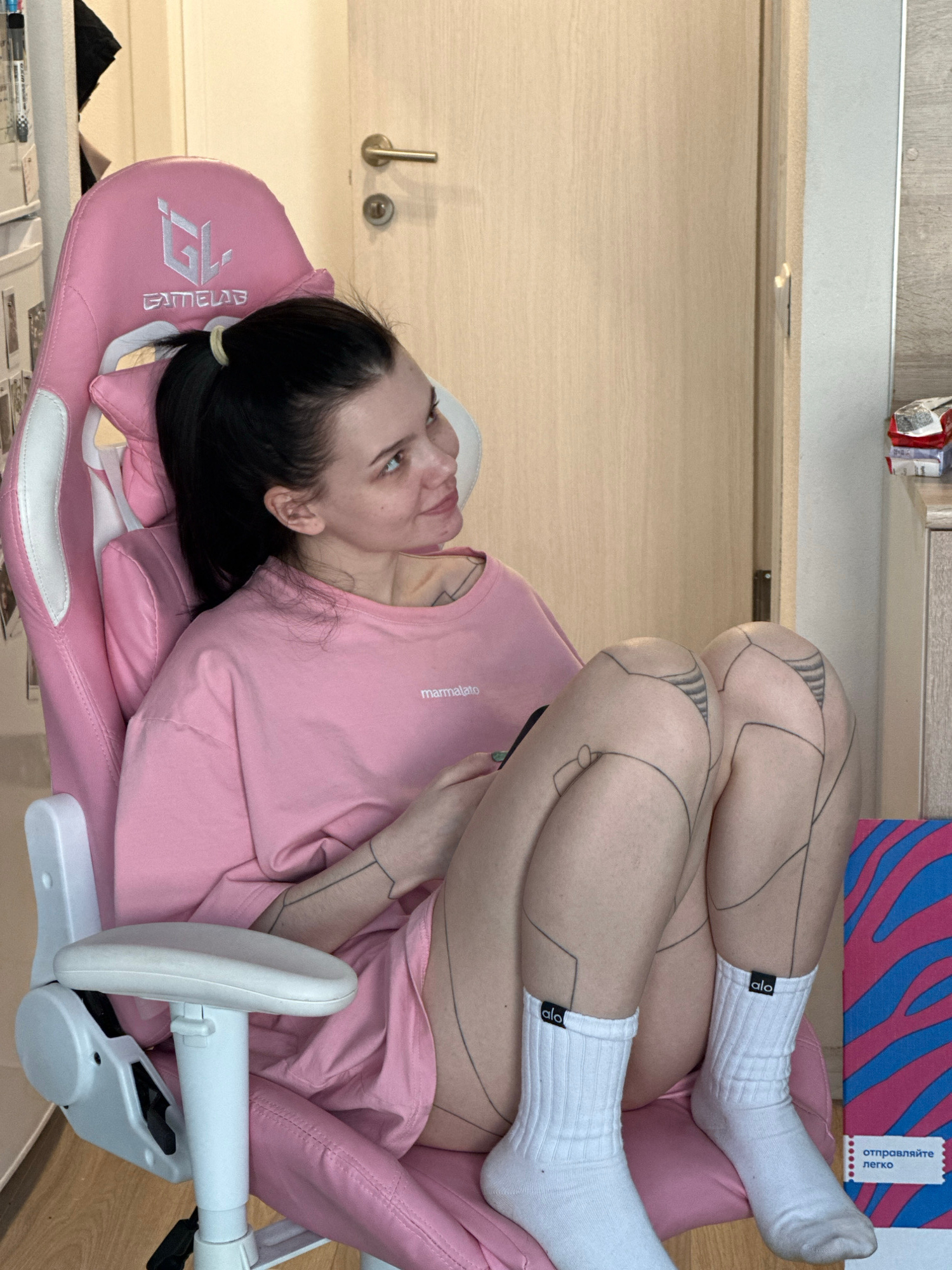 A fair-skinned woman with dark hair pulled back with a hair tie is seated in a pink gaming chair. She is wearing a pink t-shirt with the word "marmalato" printed on it. She is in an interior space, ev…read more