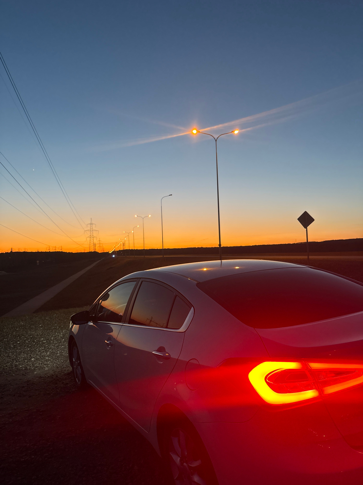 The image depicts a white car parked on a highway at dusk, likely near Chaikovsky, Russia. The car's taillight is illuminated. In the background, streetlights line the road, and a power line tower is…read more