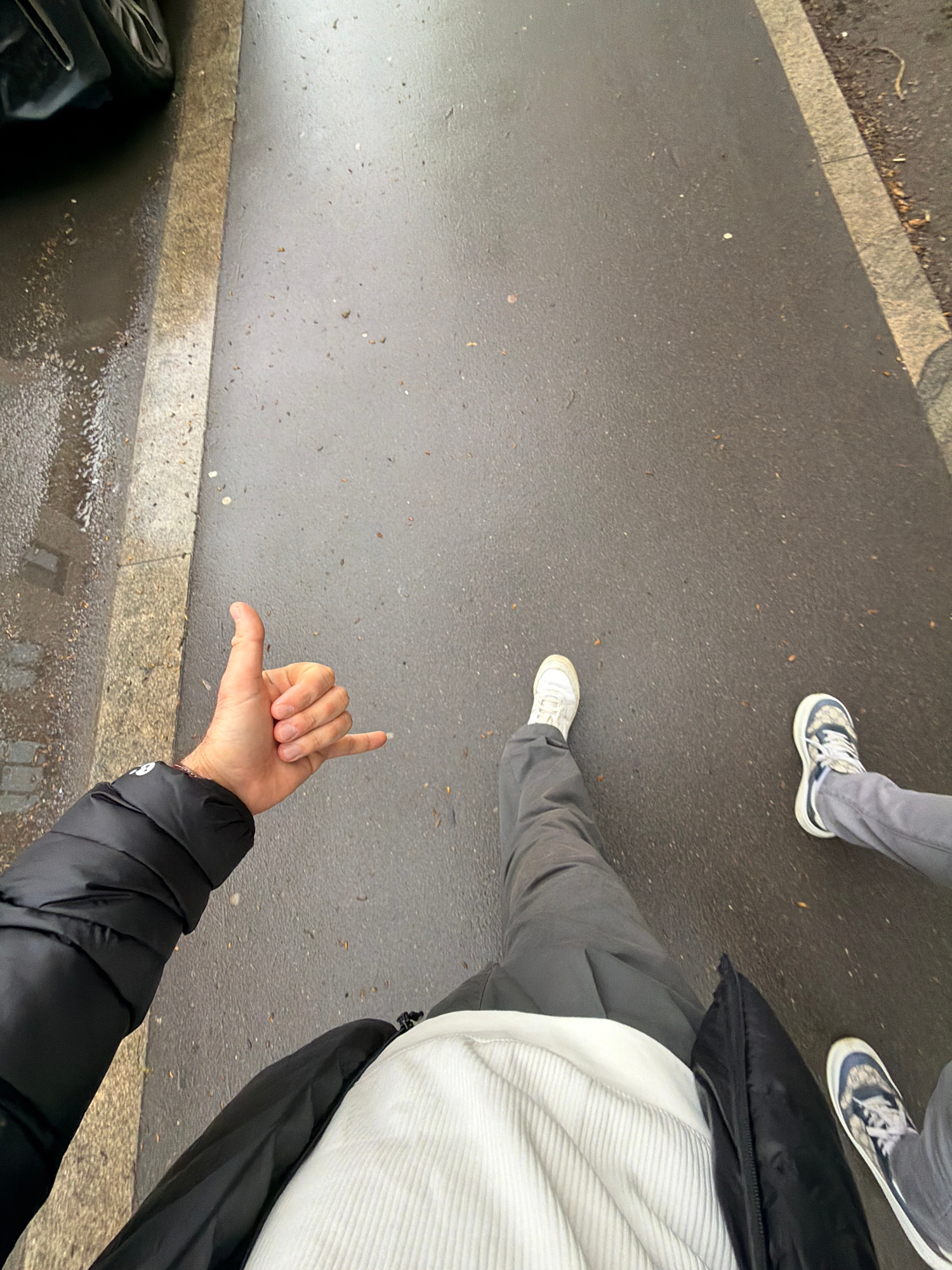 The photograph, taken from an elevated perspective, showcases a street scene. In the foreground, a hand extends from the right side of the frame, gesturing with the thumb and pinky finger extended inβ¦read more