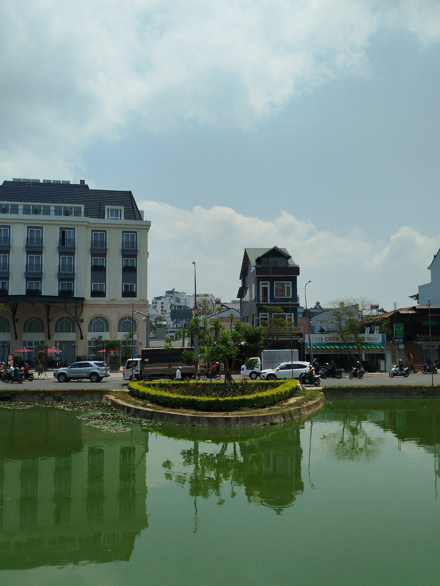 This photograph captures a cityscape in Da Lat, Vietnam. The foreground features a body of water with a green tint, reflecting the surrounding buildings and trees. An island-like structure sits in theβ¦read more