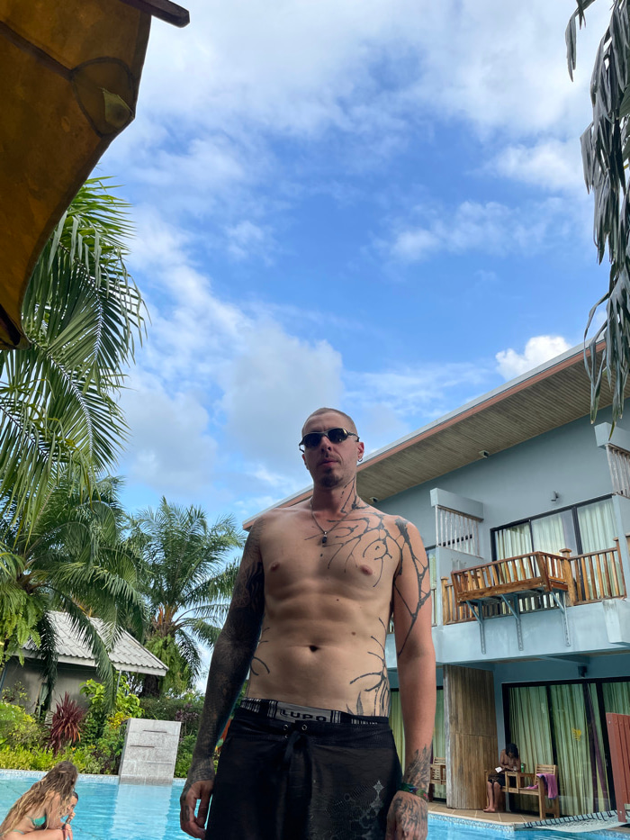 This image depicts an outdoor scene in the City of Ban Tha Muang, Thailand. A male individual stands centrally in the foreground, facing the camera. He has short, light-colored hair, wears dark sungla…read more