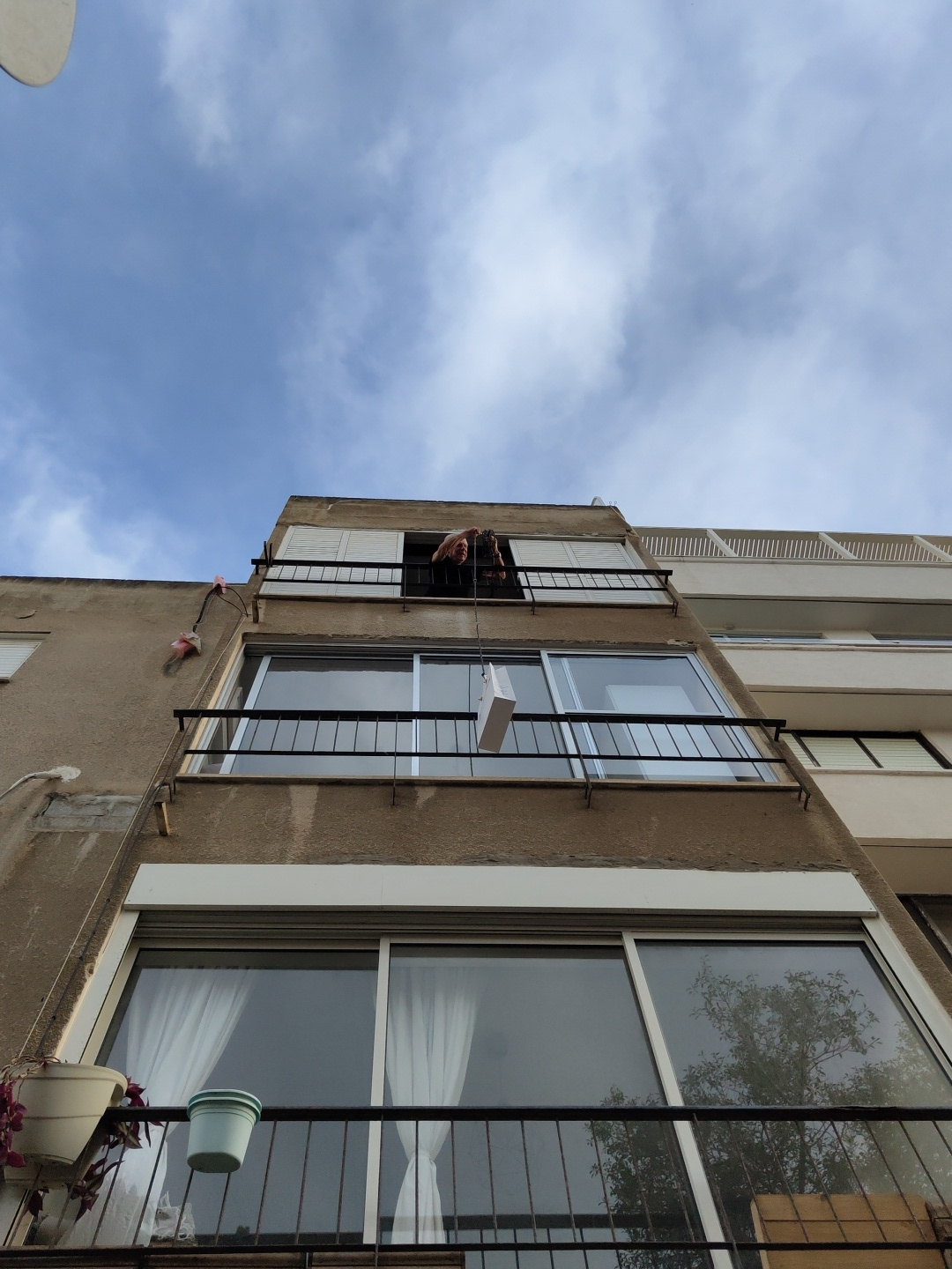 The image shows the exterior of a multi-story building, possibly residential, viewed from a low angle. Windows with bars cover most of the facade. One window shows a person leaning out, although the d…read more