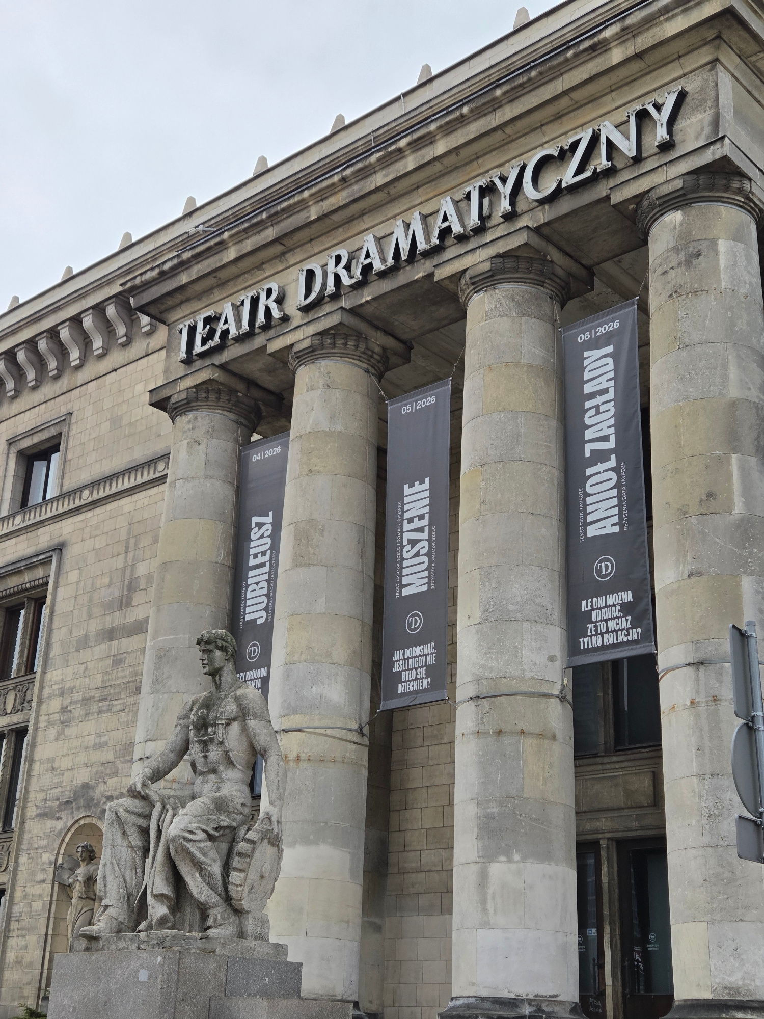 Here's a detailed description of the image: **Location:** Warsaw, Poland. The image shows the facade of the Teatr Dramatyczny (Drama Theatre). **Subject:** The focus is on the architectural details…read more