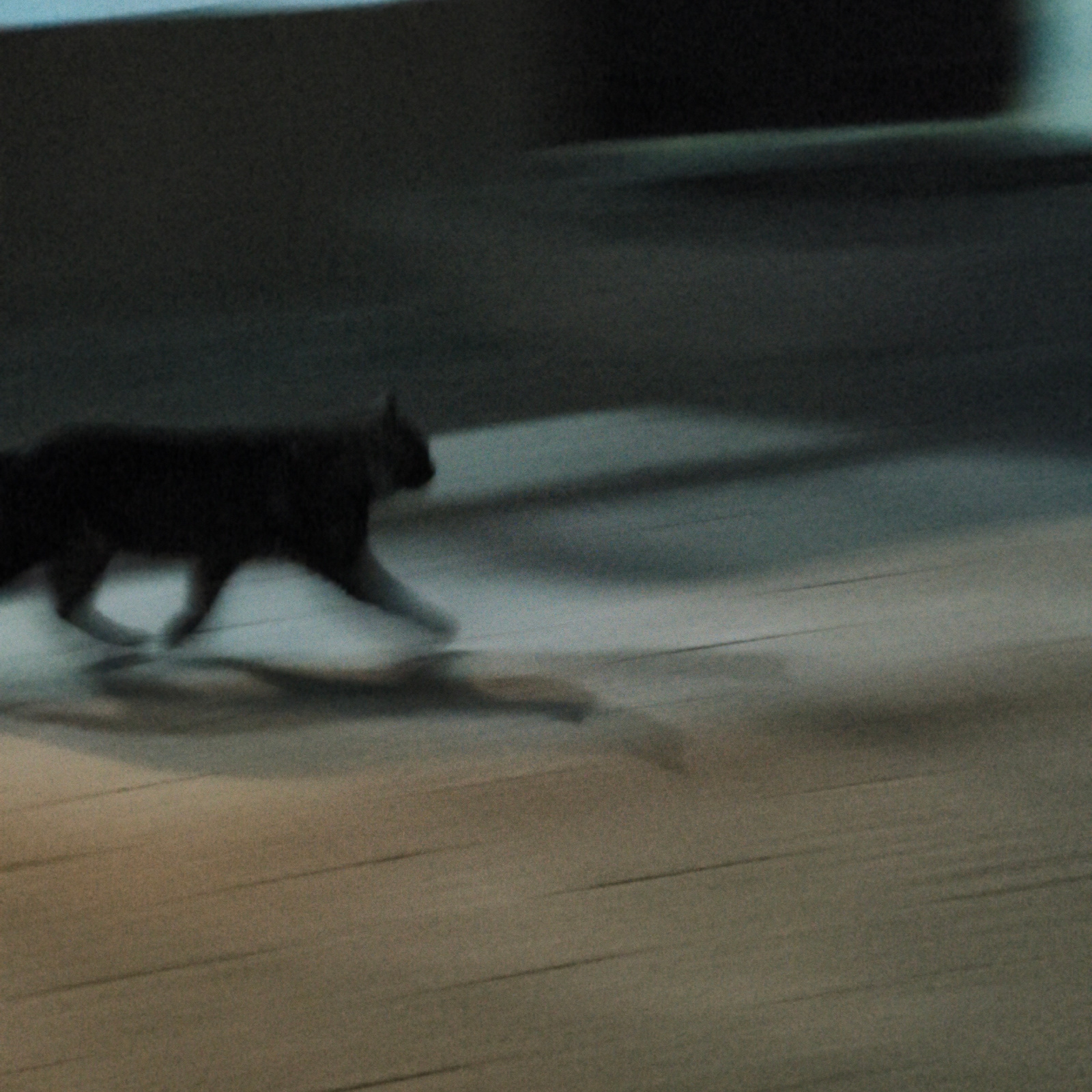 The image shows a dark, blurry figure of a cat in motion, likely running. The background is indistinct, possibly an outdoor area with flat, textured surfaces. The overall lighting suggests it is taken…read more