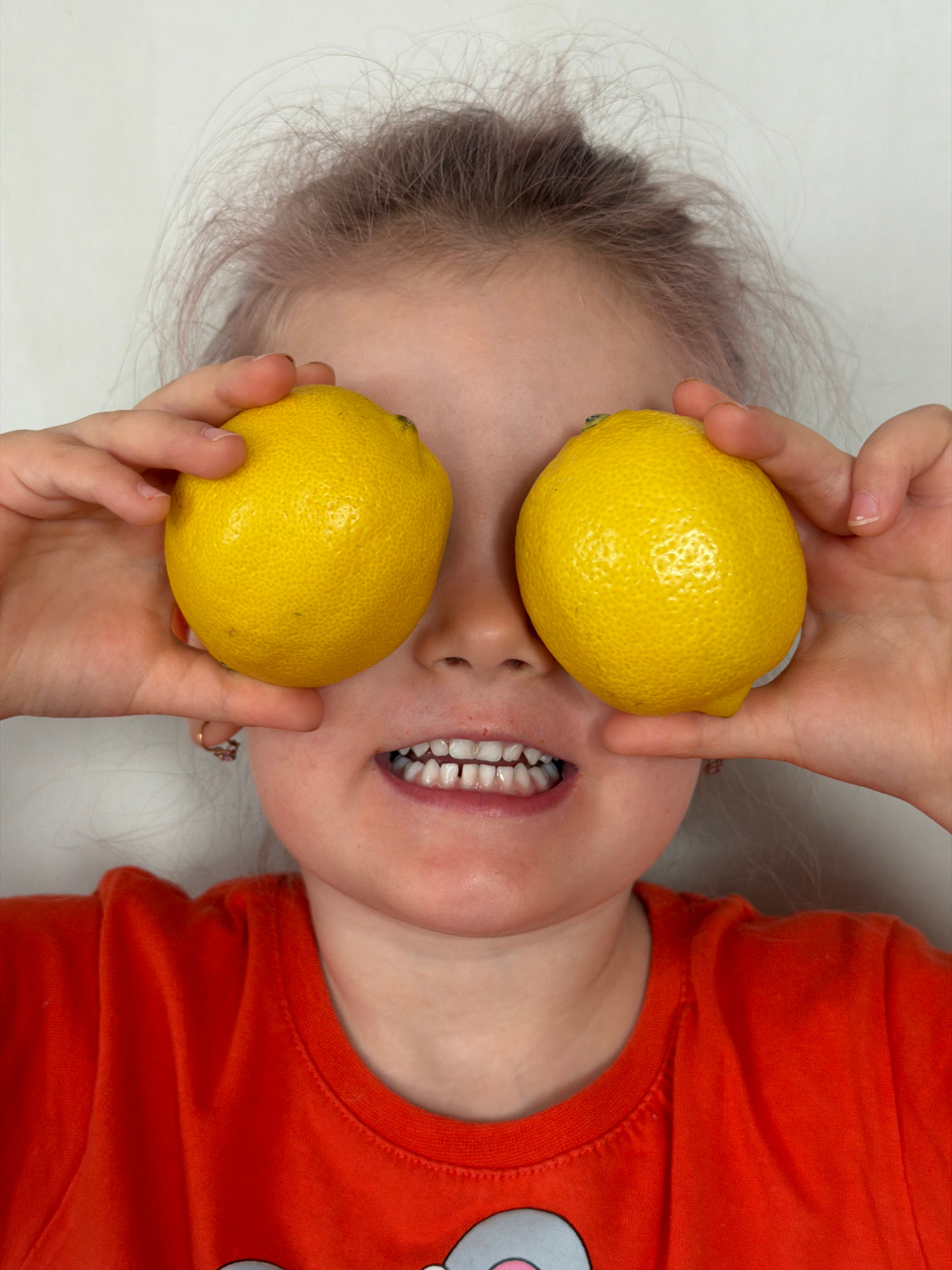 A child lies on their back, holding two lemons in front of their eyes. The child is fair-skinned, with blonde hair. They are wearing an orange shirt with a cartoon character on it. Their mouth is open…read more