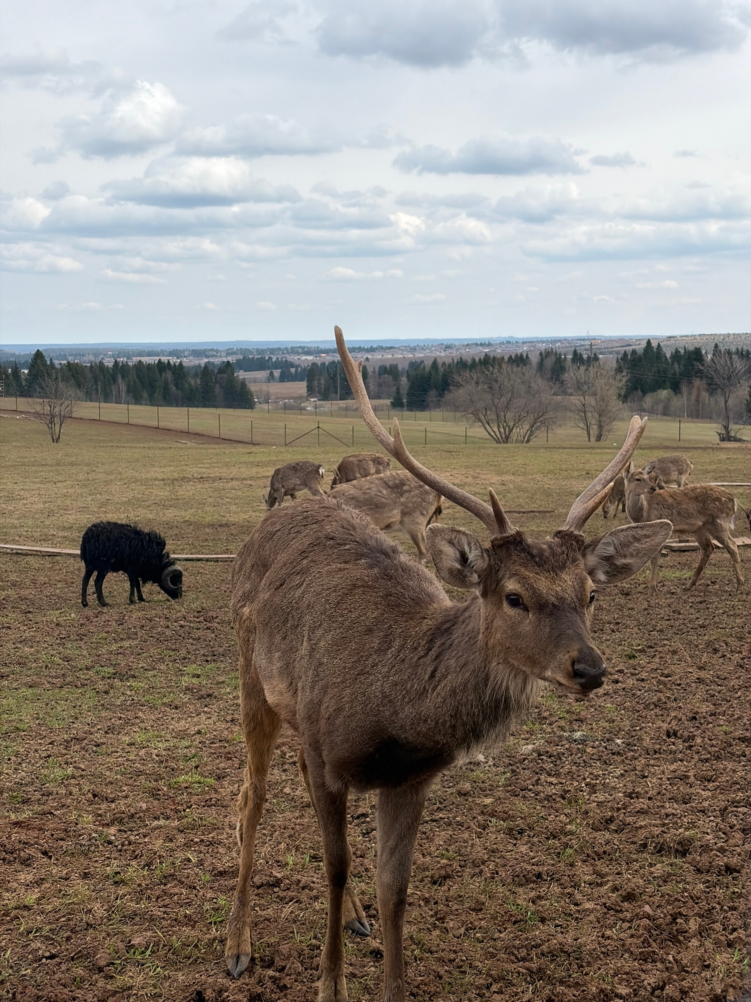 The image depicts a group of deer in a field, one prominently in the foreground with antlers. The background shows a landscape with trees and a cloudy sky. A black ram is present in the lower part of…read more