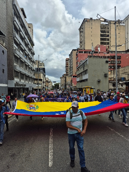 A crowd marches down a city street carrying a large Venezuelan flag. Buildings line both sides of the street, some tall and modern, others older and in disrepair. The sky is filled with clouds. A man…read more
