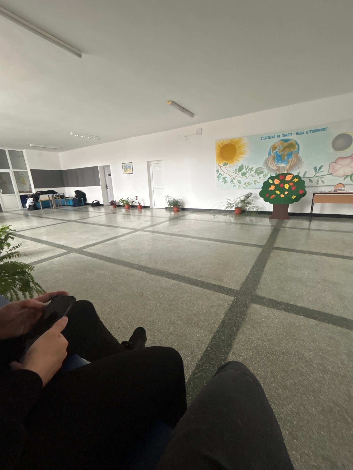 Indoor hallway in Zlatograd, Bulgaria. Concrete floor with grid pattern, white walls. Mural on one wall depicts Earth, a sunflower, and text in Bulgarian. Potted plants line the wall. Open doorway lea…read more