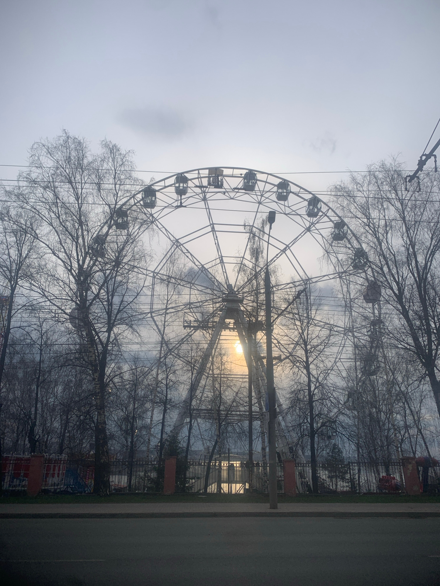 The image shows a Ferris wheel in a foggy or overcast setting. The Ferris wheel is large and appears to be constructed of metal. The background is obscured by fog or clouds. Bare trees surround the Fe…read more
