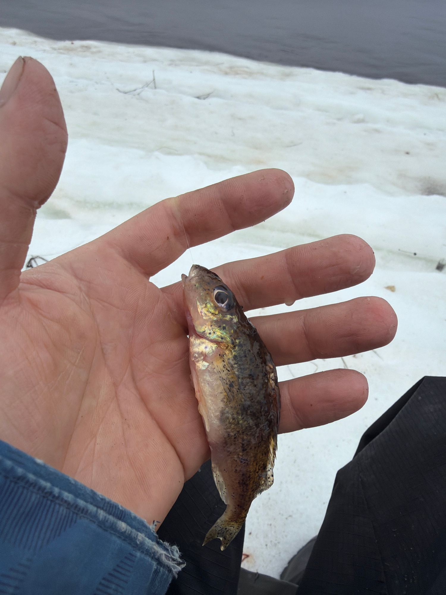 A person is holding a small fish in their hand. The fish is approximately the size of their palm, and it is yellow and brown with some black spots. The person is wearing a blue plaid shirt and black p…read more