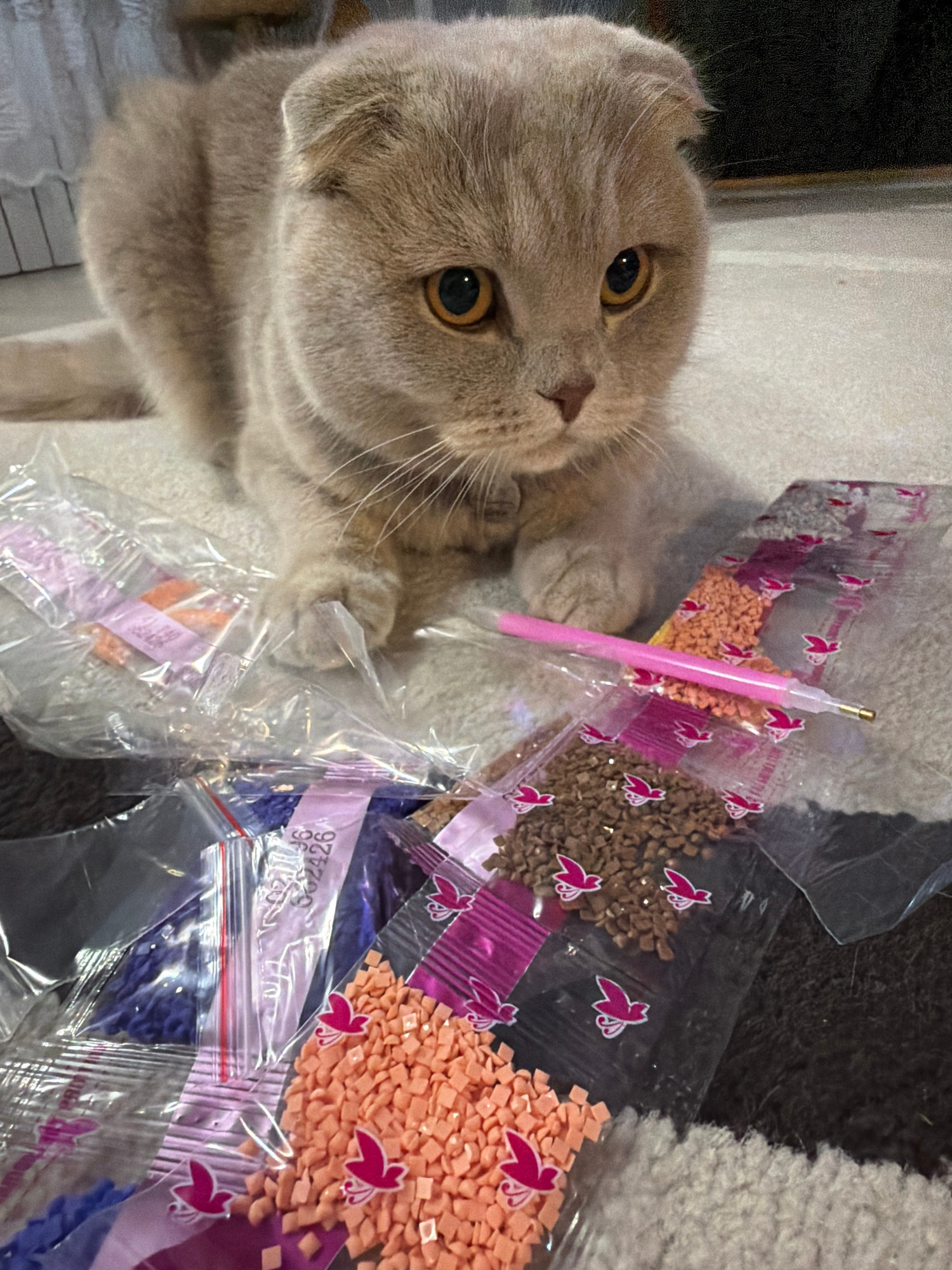 A tan Scottish Fold cat lies among several plastic bags of colorful, faceted crafting beads, and a pink tool, possibly a stylus or applicator. The setting appears to be indoors on a soft, textured sur…read more