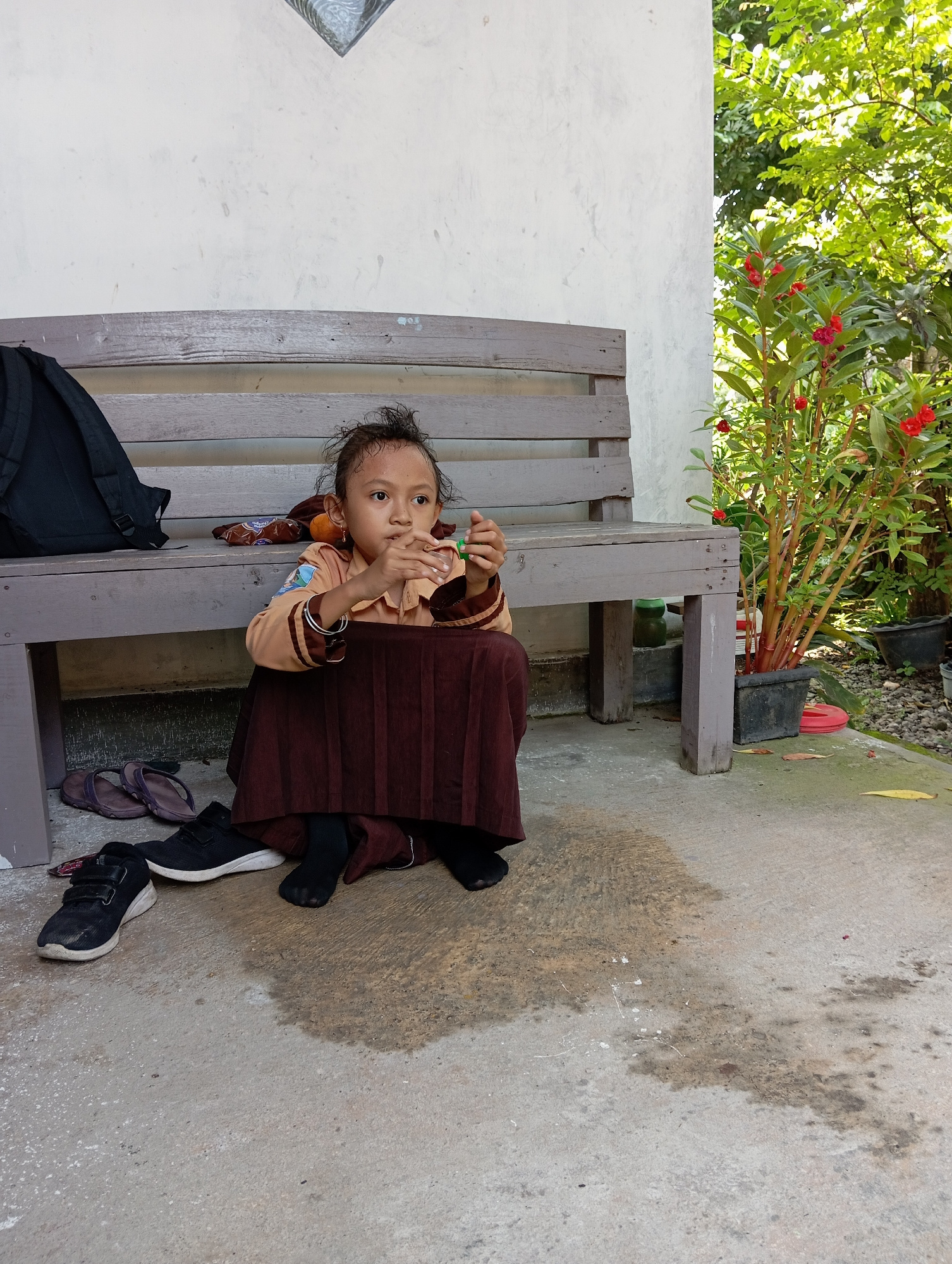 A young child, likely a girl, is seated sideways on a rustic wooden bench in an outdoor setting in Baron, Indonesia. She is dressed in a beige-colored long-sleeved top with brown cuffs and collar, and…read more