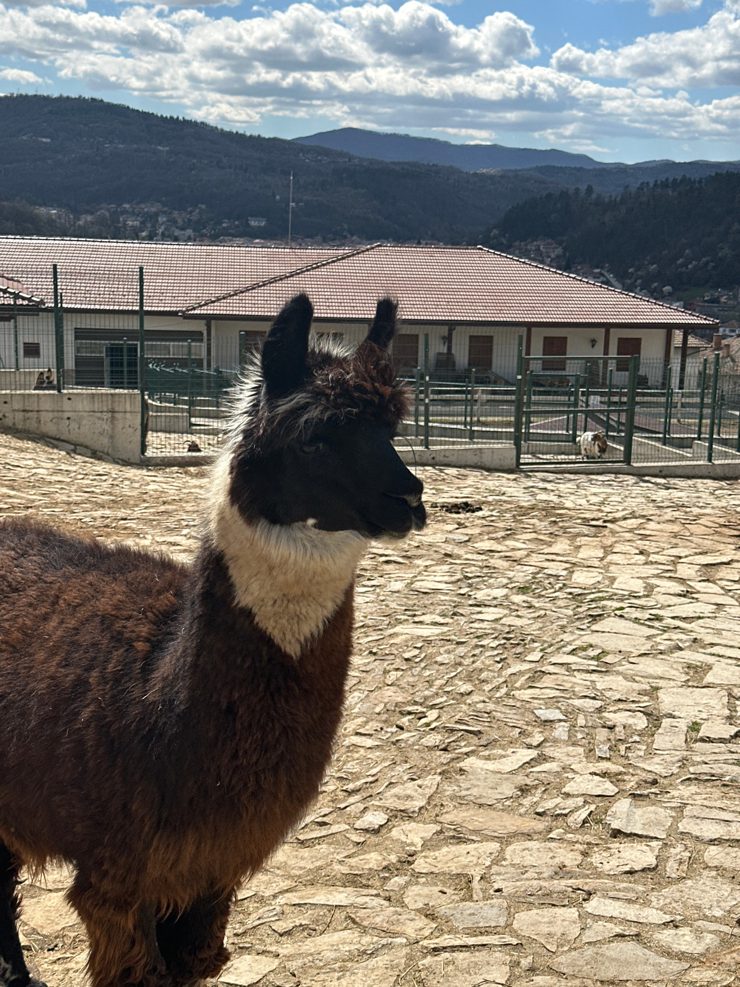 The image shows a llama in Chernovrah, Bulgaria. The llama has black and white markings on its head and neck, with brown fur on its body. It is standing on a paved stone surface. Behind the llama is a…read more