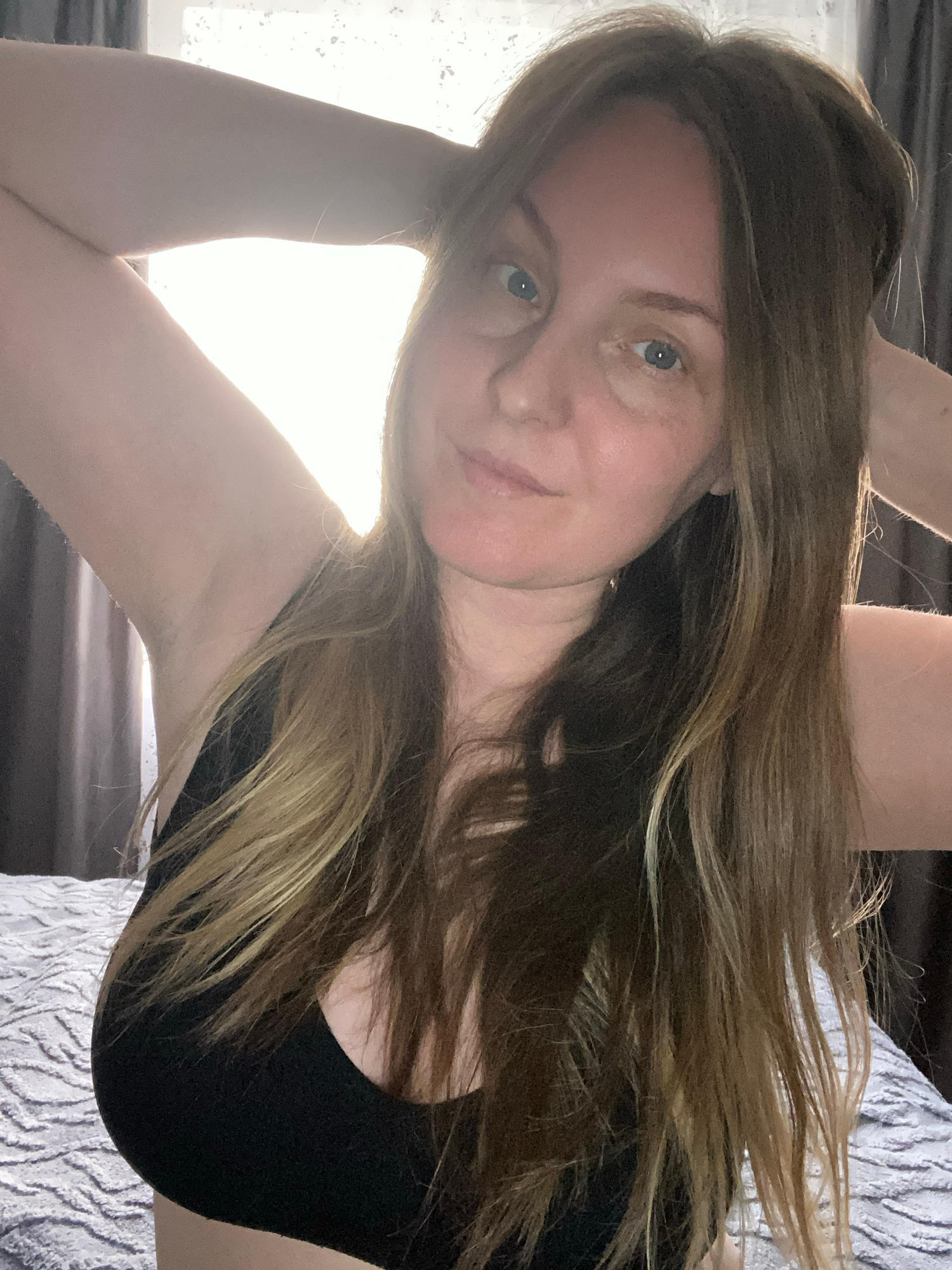 A woman with long, light brown hair and blue eyes is reclining. She is wearing a black top. Her left arm is raised behind her head, and her right arm is bent at the elbow. The background appears to be…read more
