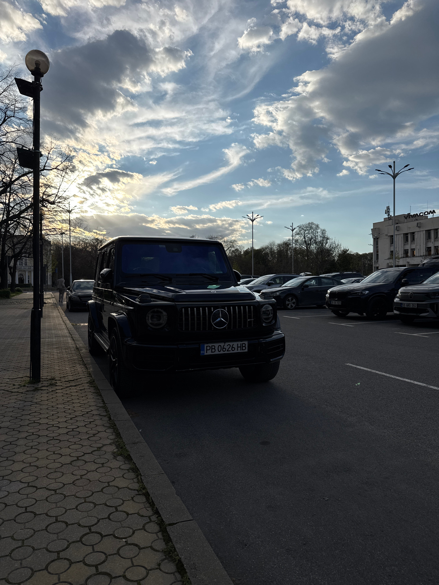 A street scene in Plovdiv, Bulgaria. A black Mercedes-Benz G-Class is parked along the curb. The license plate is "PB 0626 HB". Several other cars are parked behind it. In the background are buildings…read more