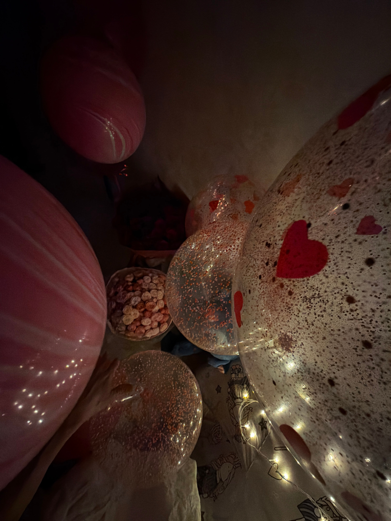 The image depicts an interior scene, possibly a room decorated for a special occasion. Dominating the view are several balloons of varying sizes and designs. Some balloons are transparent with red hea…read more