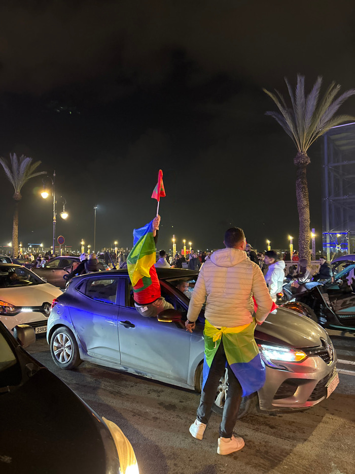 Night scene showcasing people celebrating, possibly a victory. Cars line the street under lampposts. One man is leaning on a car, draped in a green and blue flag. Another person is visible inside the…read more
