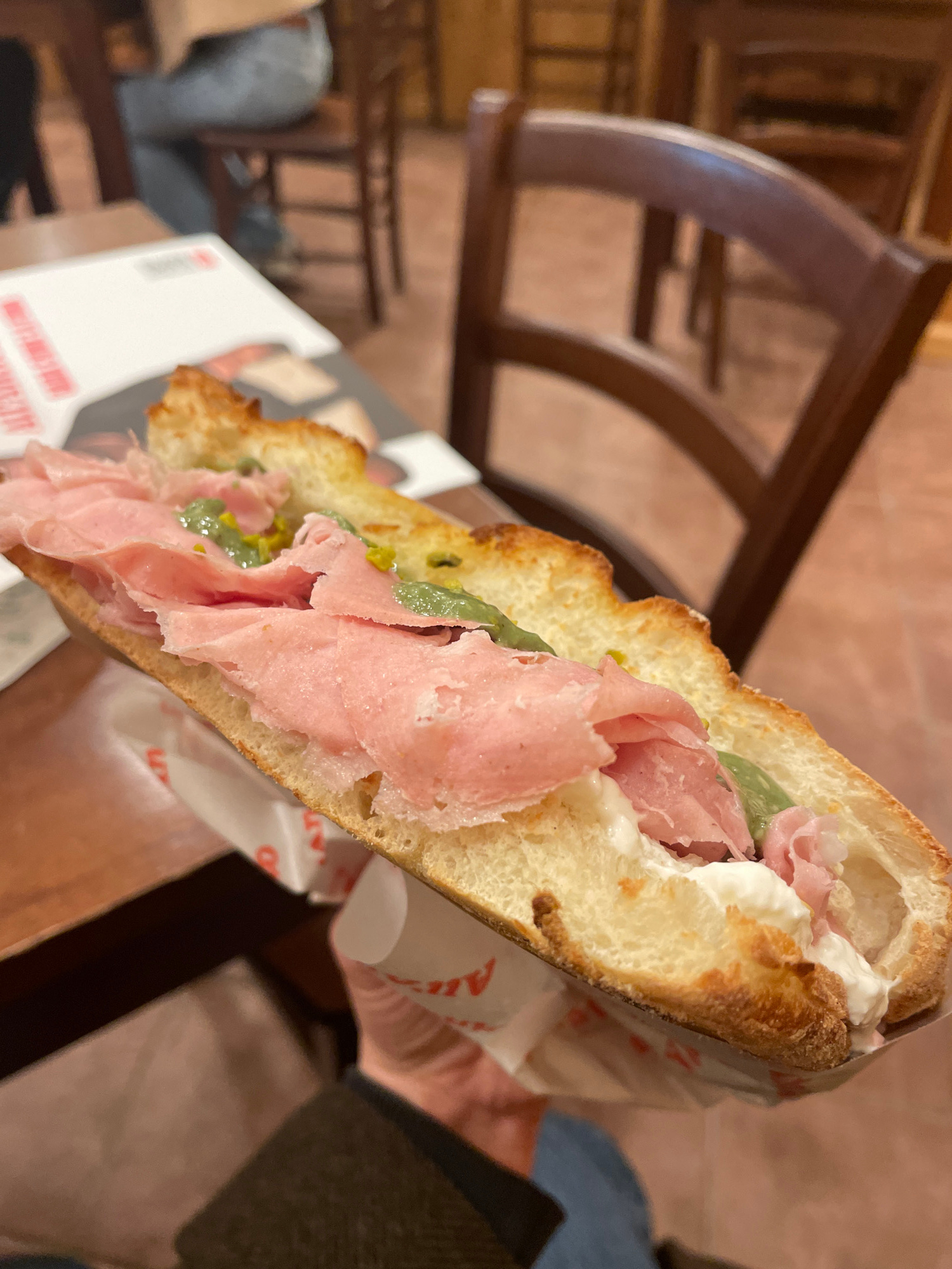 The image depicts the interior of a casual eatery in Naples, Italy. A person, whose hand is visible, holds a large, open-faced sandwich. The sandwich consists of a toasted, golden-brown bread base genβ¦read more