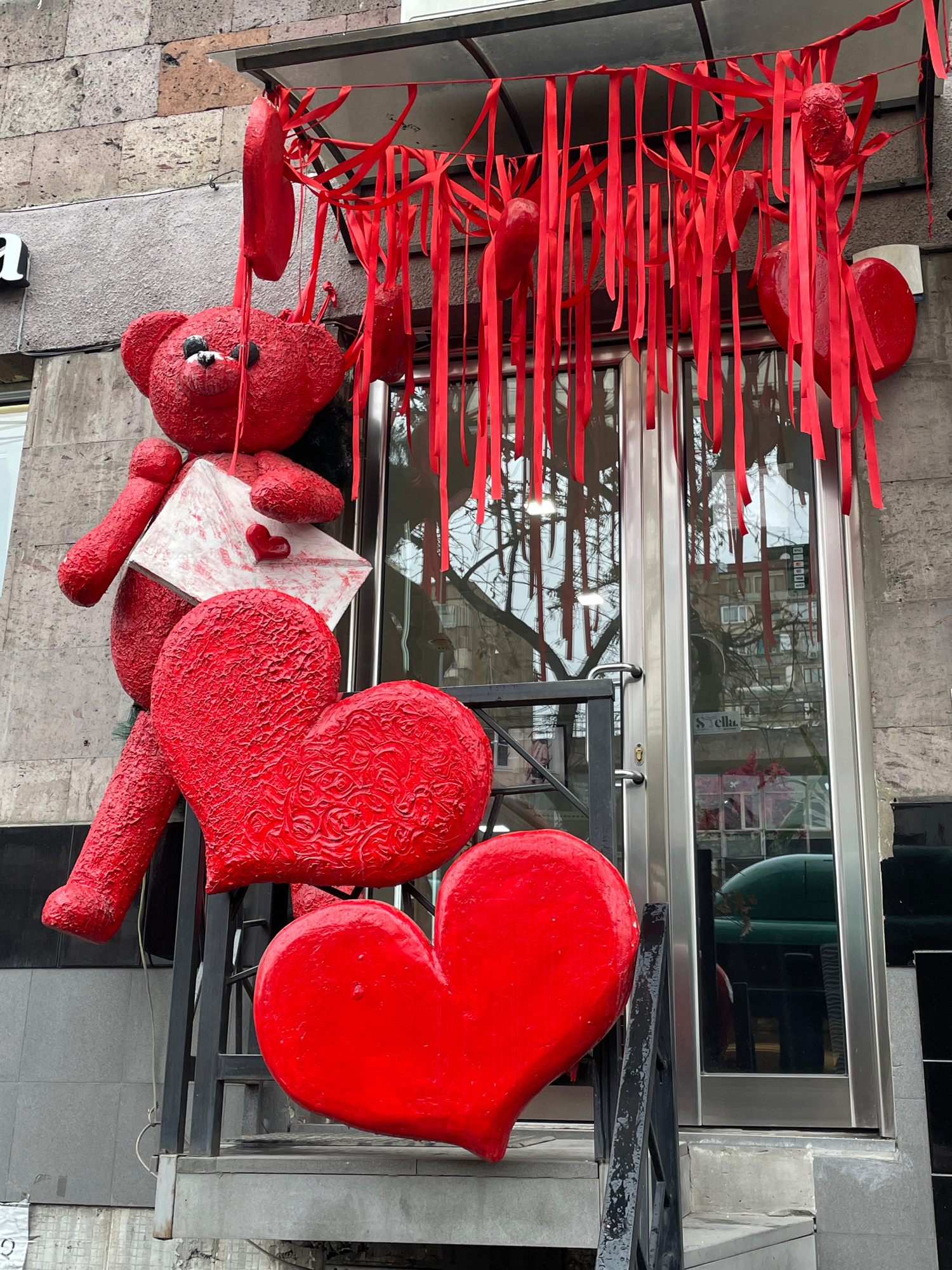 A commercial entrance in Yerevan, Armenia, features a large, red, textured teddy bear statue positioned on a raised concrete platform. The bear holds a white envelope with a small red heart emblem. Be…read more