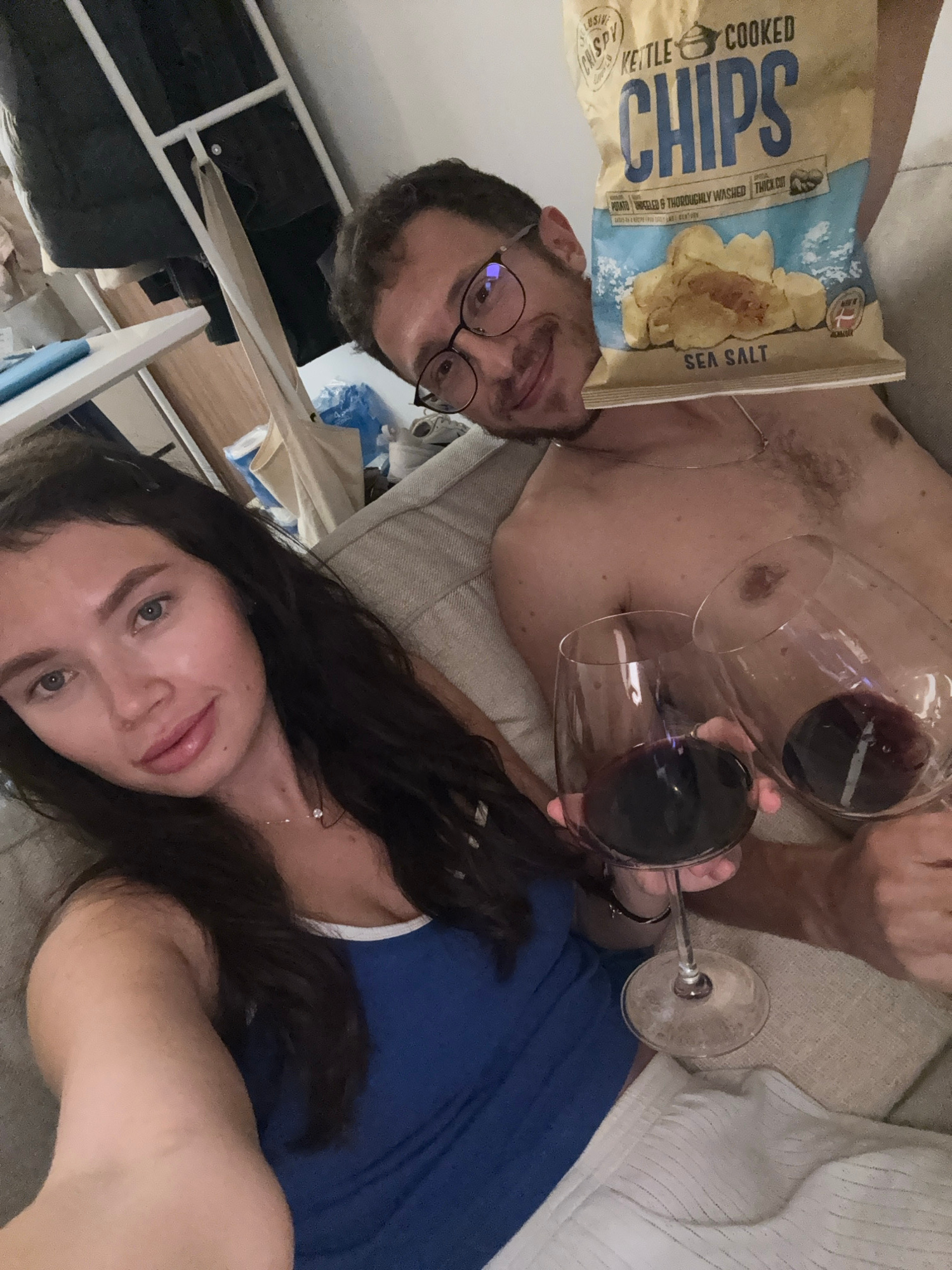 A photo shows a man and a woman reclining together. The man, with glasses and short dark hair, holds a bag of Kettle Cooked Chips (Sea Salt flavor). He appears to be shirtless. He is holding a wine gl…read more