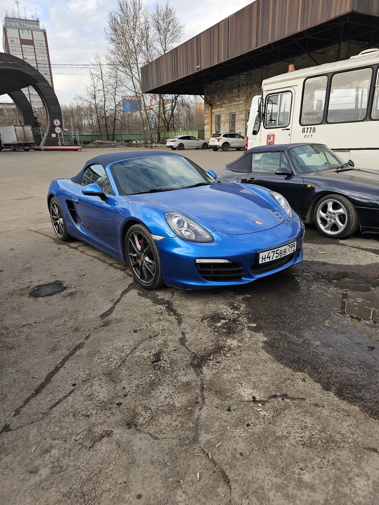 The image shows a blue Porsche parked on a concrete surface next to other vehicles, including a white bus or truck. The license plate of the Porsche reads "H475BB799". The location is likely Khimki, R…read more