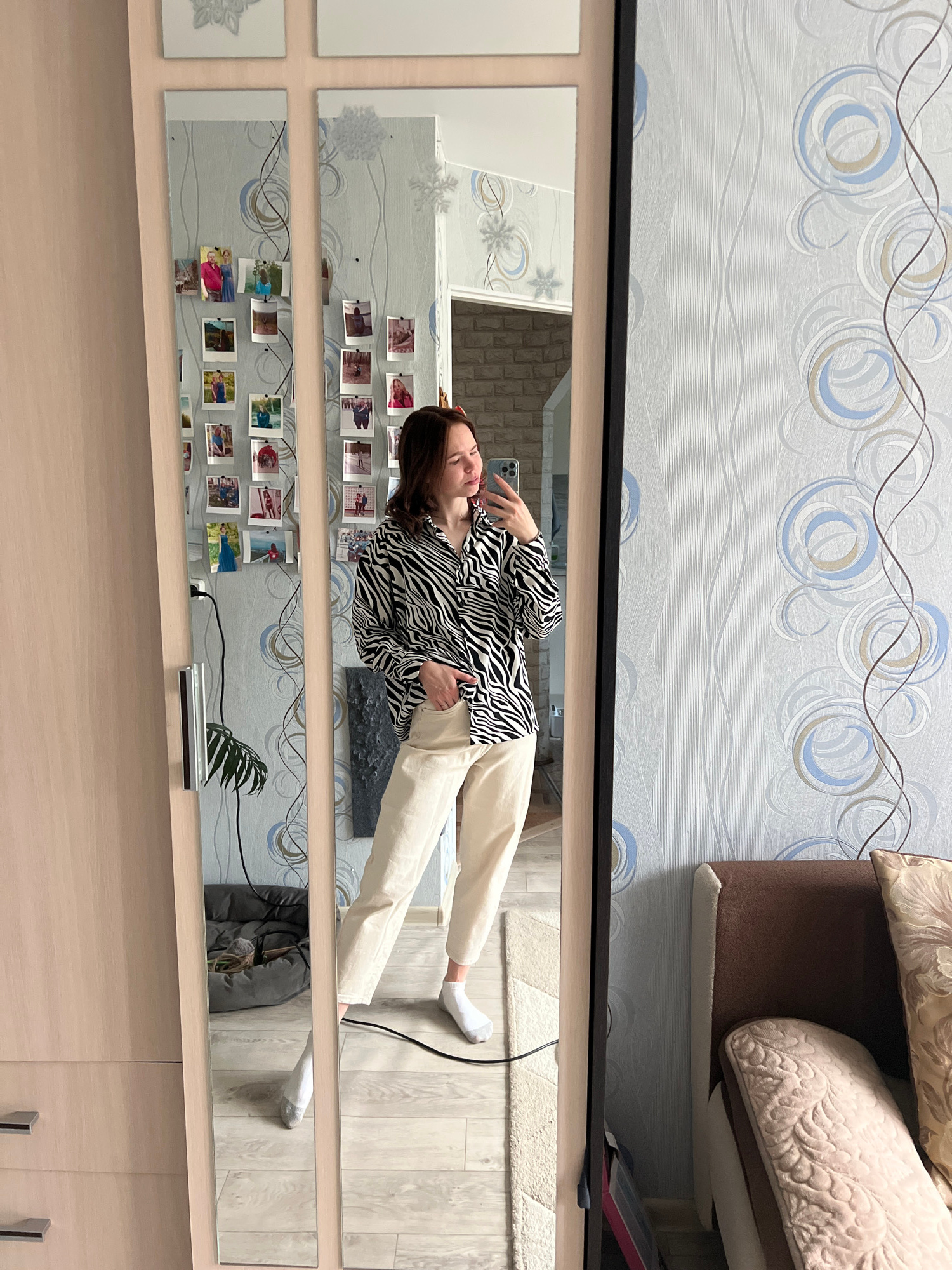 A woman is captured in a full-body mirror selfie, standing upright indoors. She has dark hair and is wearing a black and white zebra-print long-sleeved shirt paired with light-colored, possibly beige,…read more