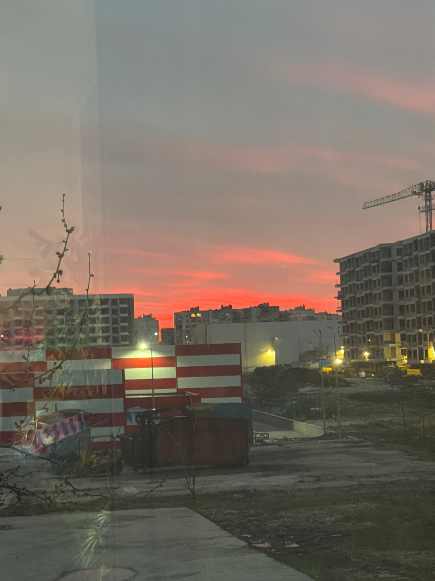 The image shows a cityscape at sunset. The sky is a gradient of gray and pink, with streaks of red. Several buildings are visible, including a large apartment building under construction with a crane.…read more