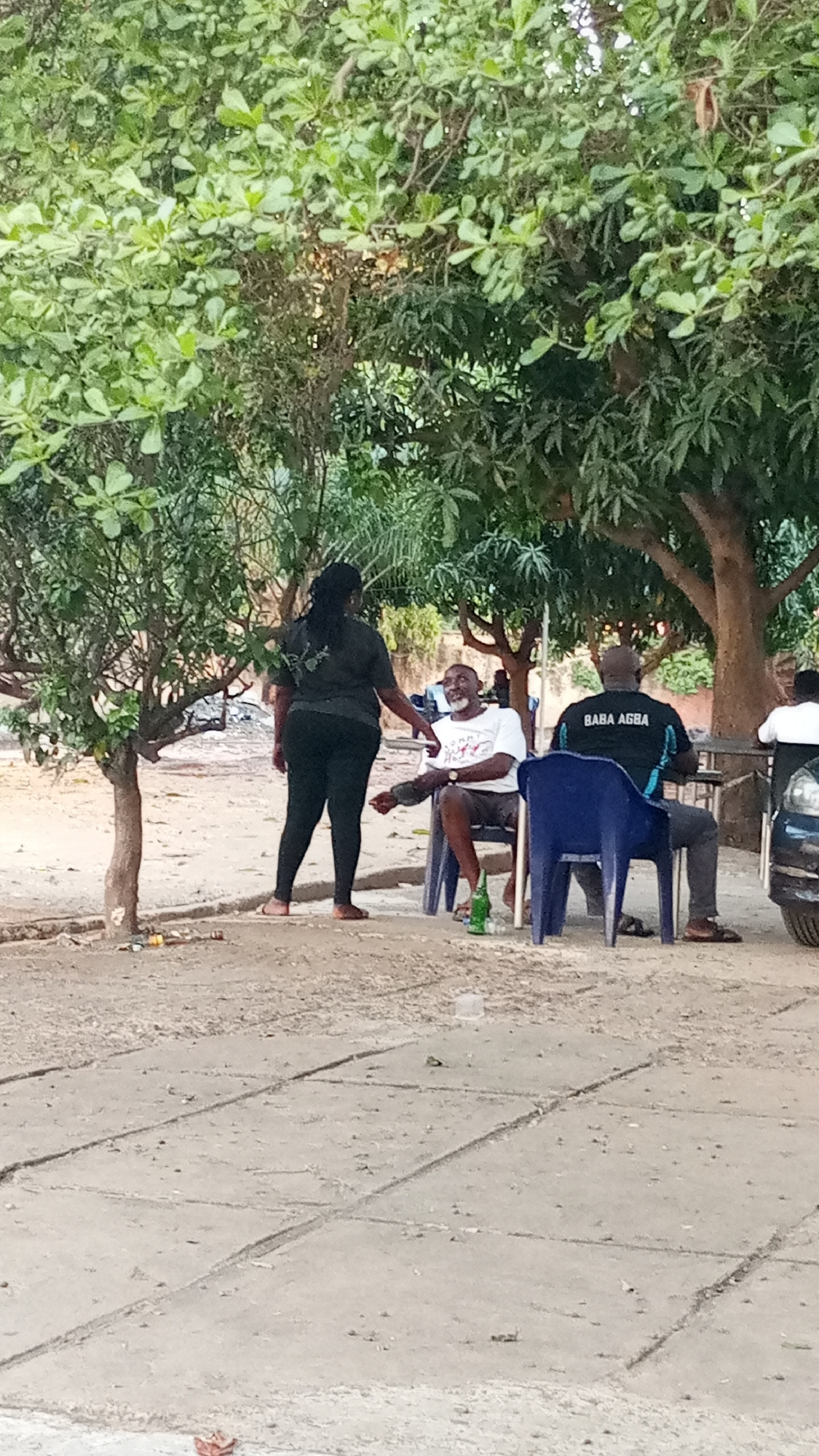 The image depicts an outdoor scene in Adankolo, Nigeria. Three individuals are seated on blue plastic chairs under the shade of trees. The seated figures include one male wearing a white t-shirt and a…read more