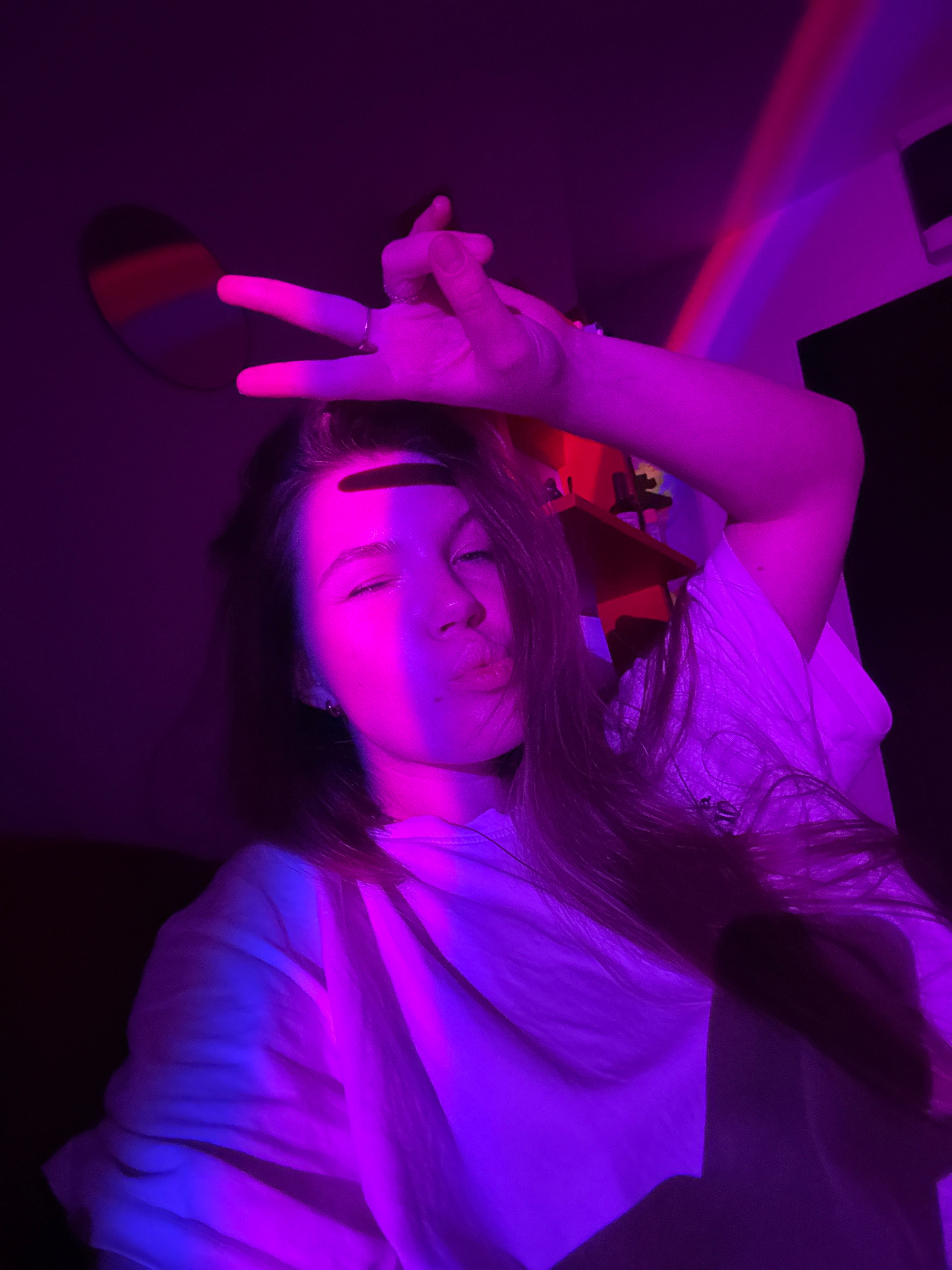 The image displays a person, likely female, captured in a darkly lit indoor setting, bathed in striking neon purple, pink, and blue light. The subject is positioned diagonally, appearing to be lying d…read more