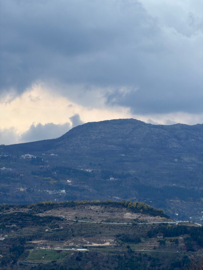 This image depicts a mountainous landscape within the city of Vila Real, Portugal. The upper portion of the frame is occupied by an overcast sky, characterized by dark grey stratocumulus clouds. A bri…read more