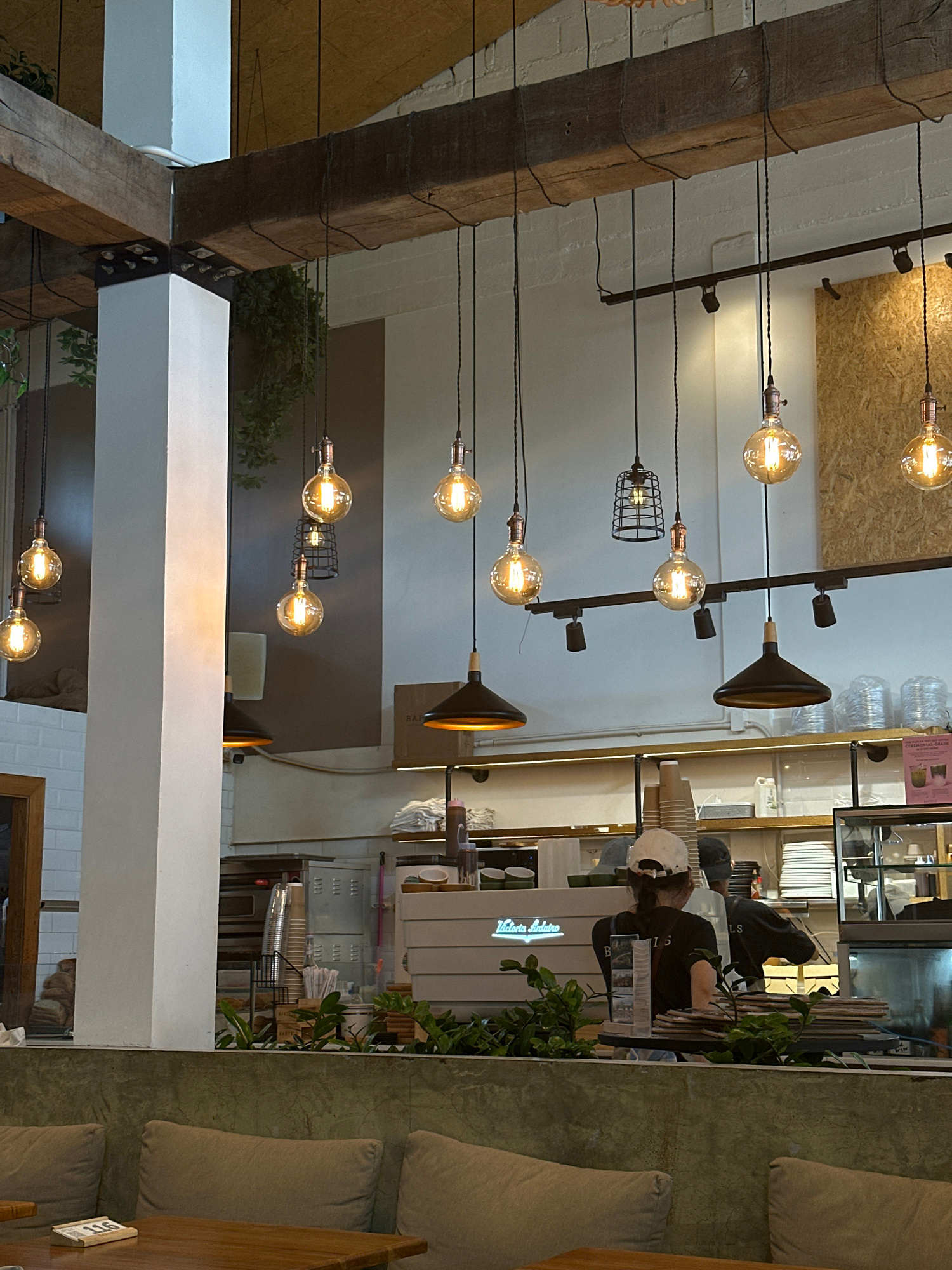 The image shows the interior of a cafe or restaurant in Choeng Thale, Thailand. The scene is characterized by rustic-industrial design elements, notably exposed wooden beams crisscrossed with electric…read more