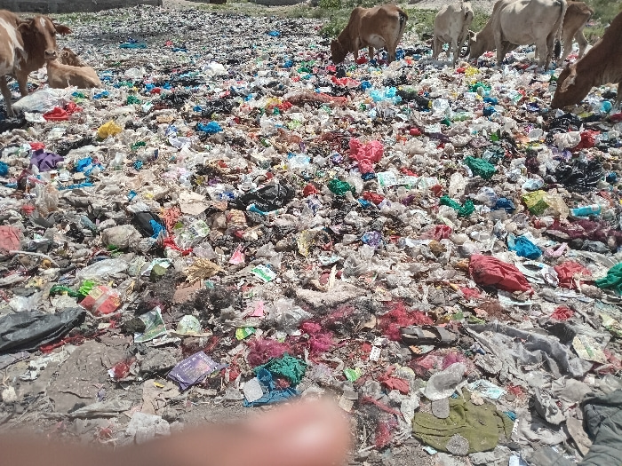 The image displays an expansive, open-air informal waste disposal site situated within Nairobi, Kenya, under clear daylight conditions. The ground is densely covered with a varied accumulation of soli…read more