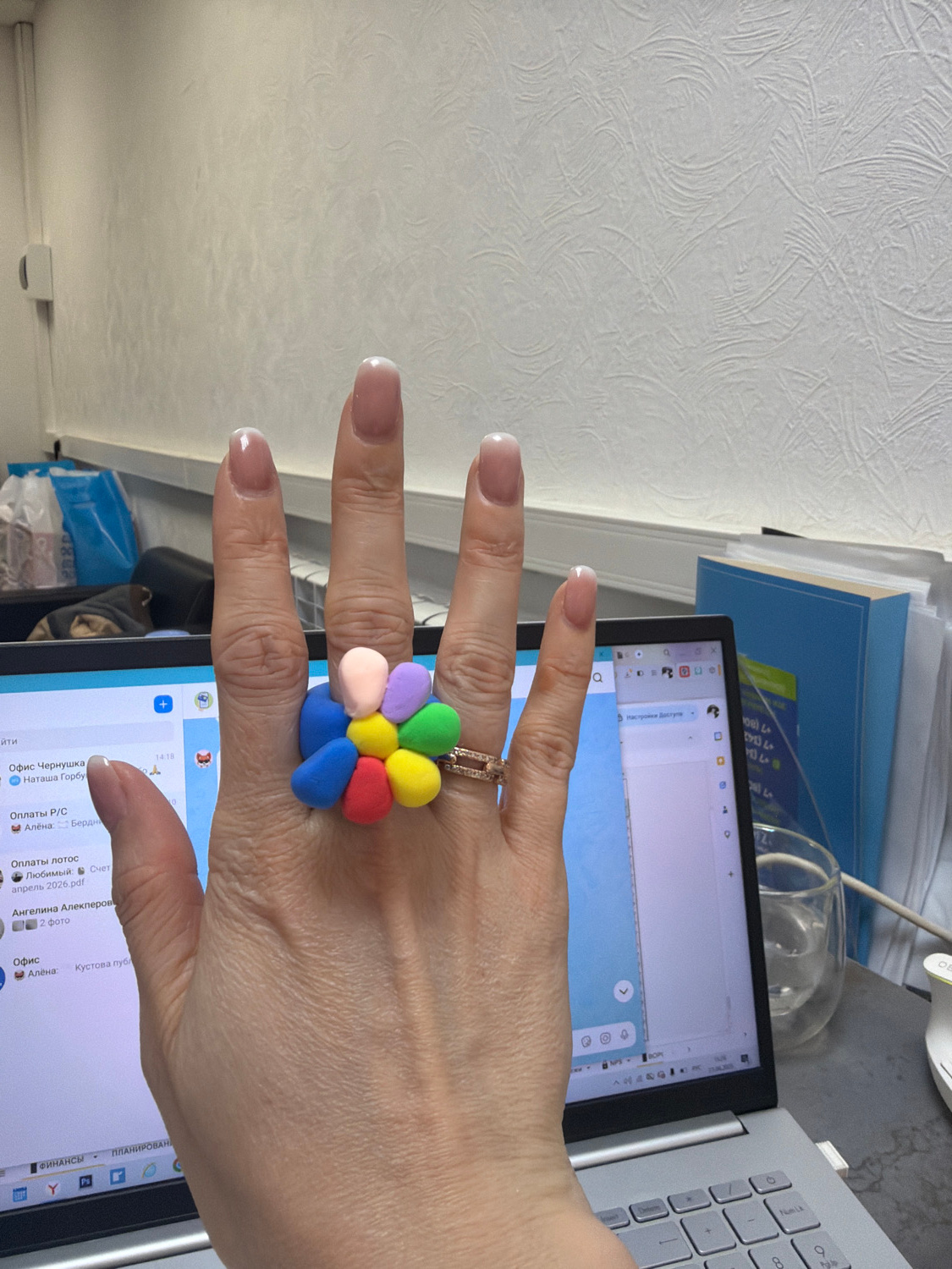 An eye-level shot captures a person's right hand positioned over an open laptop, likely in an indoor office or home environment in Chaikovsky, Russia. The hand features well-groomed nails with a Frenc…read more