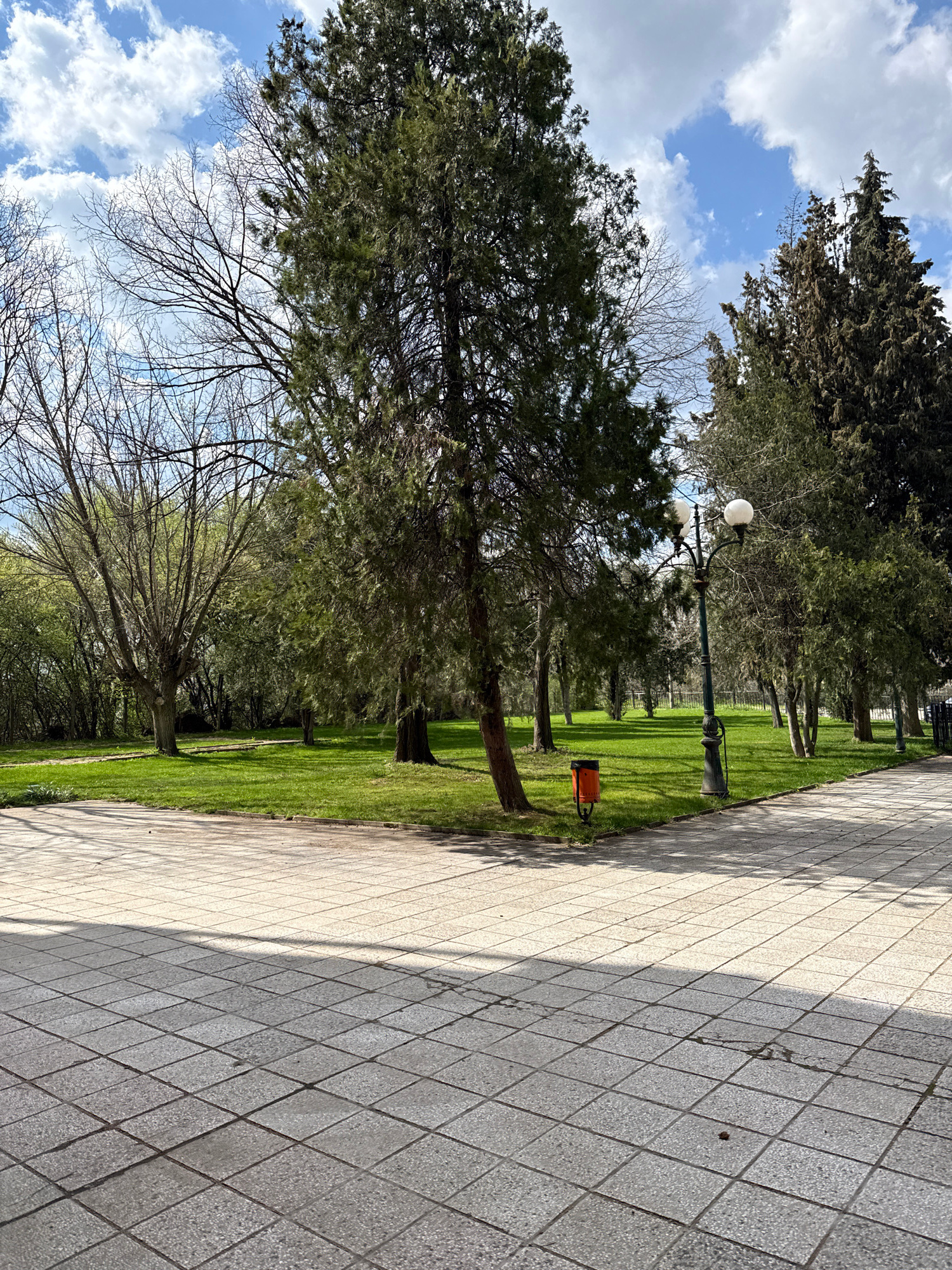 The image shows a park-like area in Stara Zagora, Bulgaria, near a paved walkway. The walkway is made of light gray square tiles and is bordered by a strip of green grass. Several trees, mostly evergr…read more