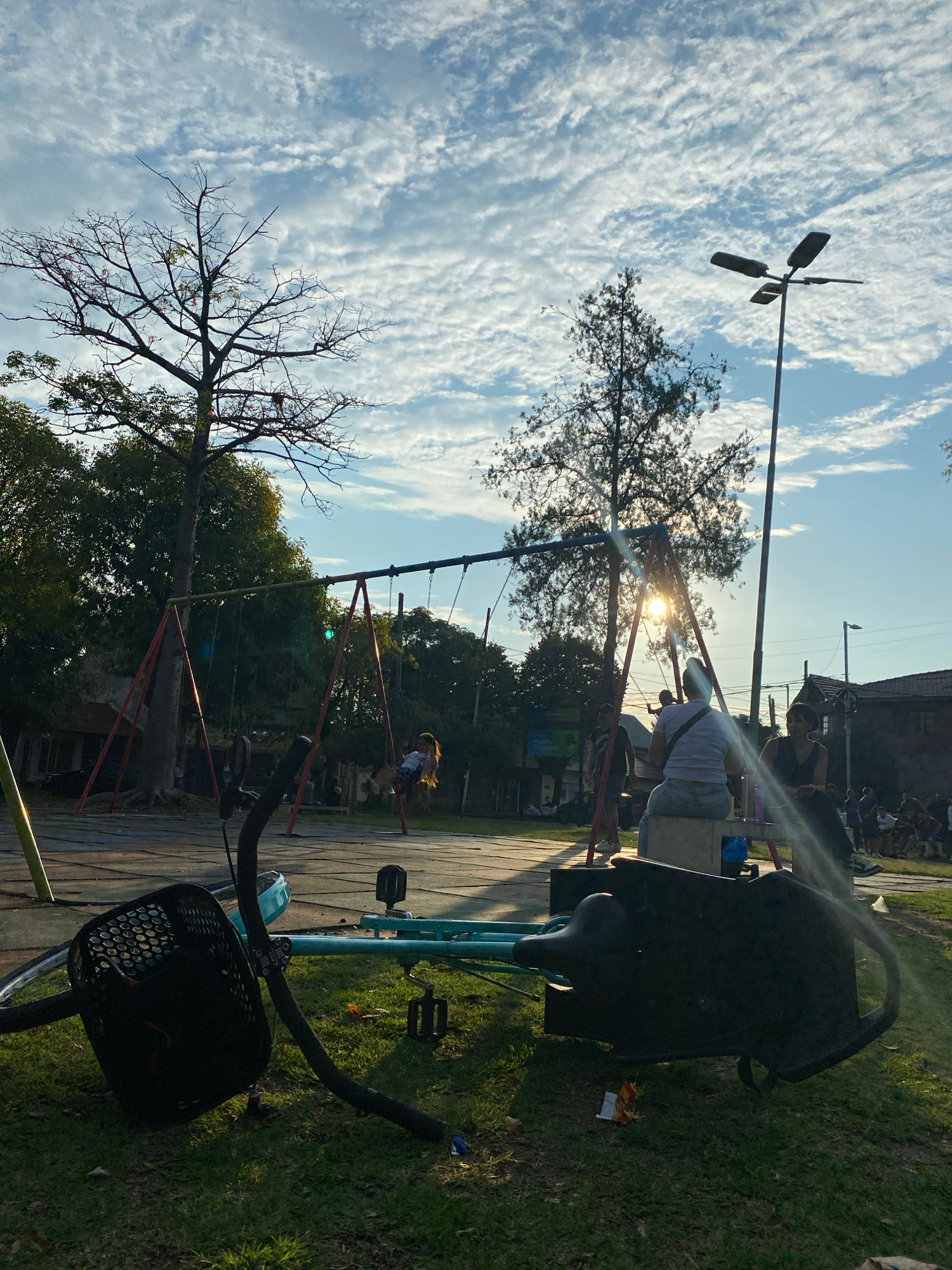 The image shows a park scene in Wilde, Argentina. A bicycle with a front basket is in the foreground, partially obscuring the view. Further in the background are playground swings in use by children.…read more