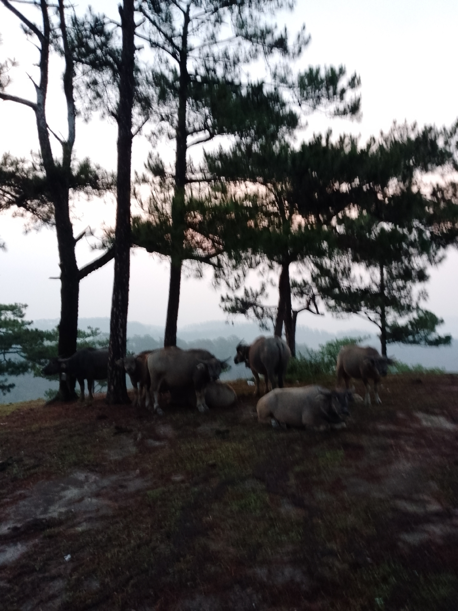 The image depicts a serene outdoor scene featuring a herd of water buffaloes gathered among tall pine trees on a grassy hill, likely in Lạc Dương, Vietnam. Approximately 8-10 buffaloes are visible, va…read more