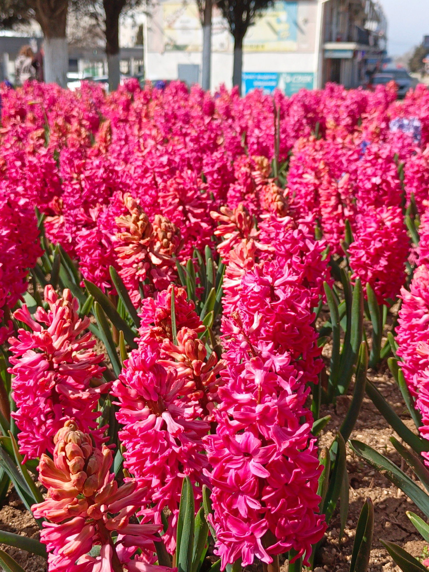 The scene displays an urban flowerbed in Sevastopol, Ukraine, dominated by a dense arrangement of blooming hyacinths. The flowers are primarily a vibrant deep pink or fuchsia, with some exhibiting an…read more