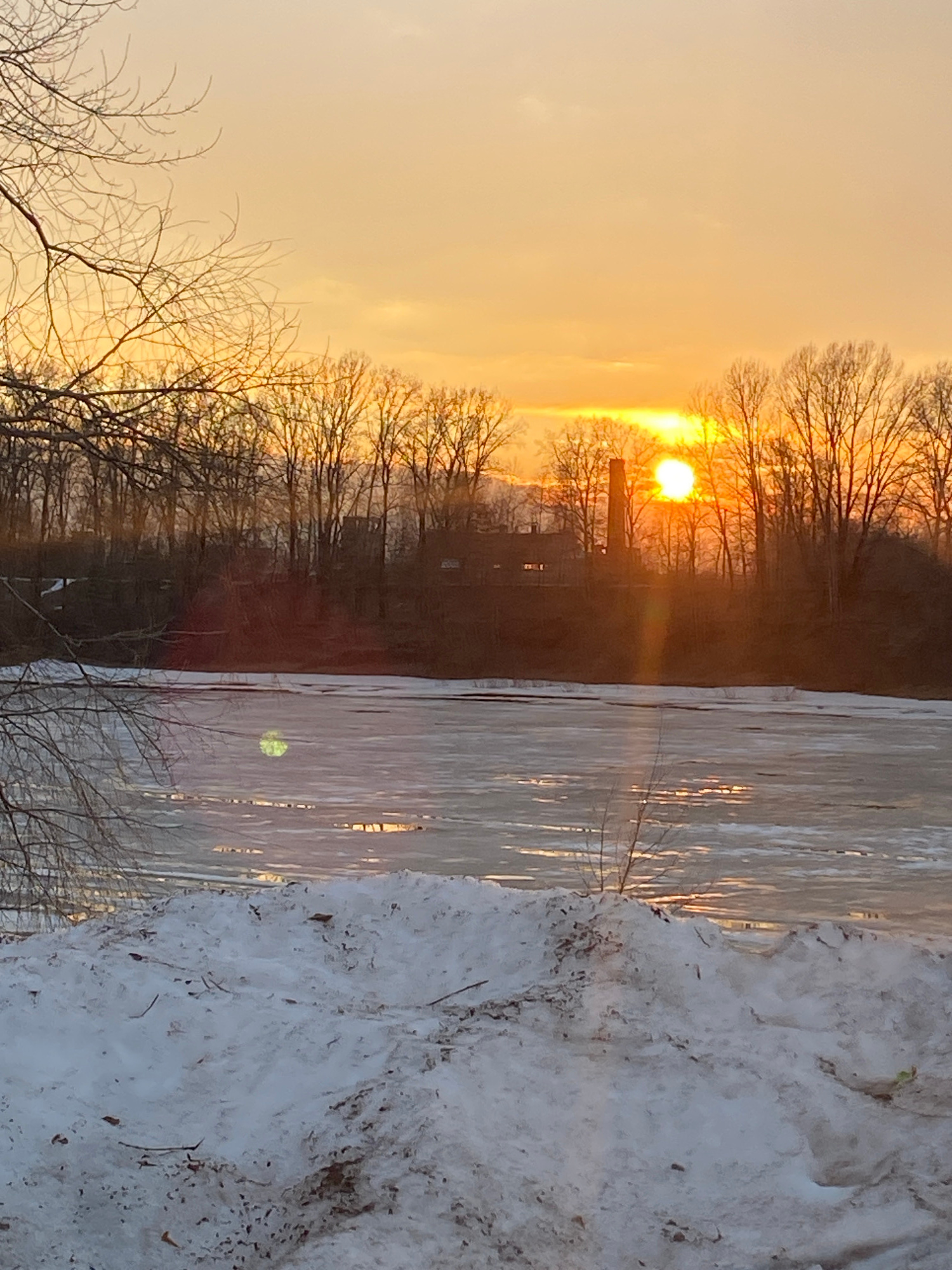 The image shows a winter scene, potentially at sunset or sunrise, with a body of water largely covered in ice and snow. The sky is a yellowish-orange hue, with the sun visible through bare trees on th…read more
