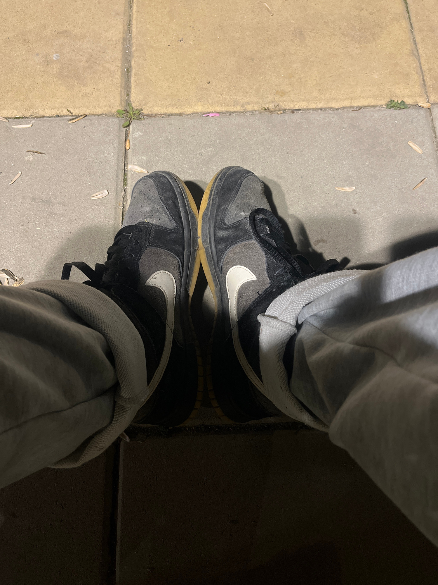 The image shows a person standing on a paved surface, likely a sidewalk. The surface is composed of square paving stones of two different colors - tan and gray. There is a small patch of greenery grow…read more