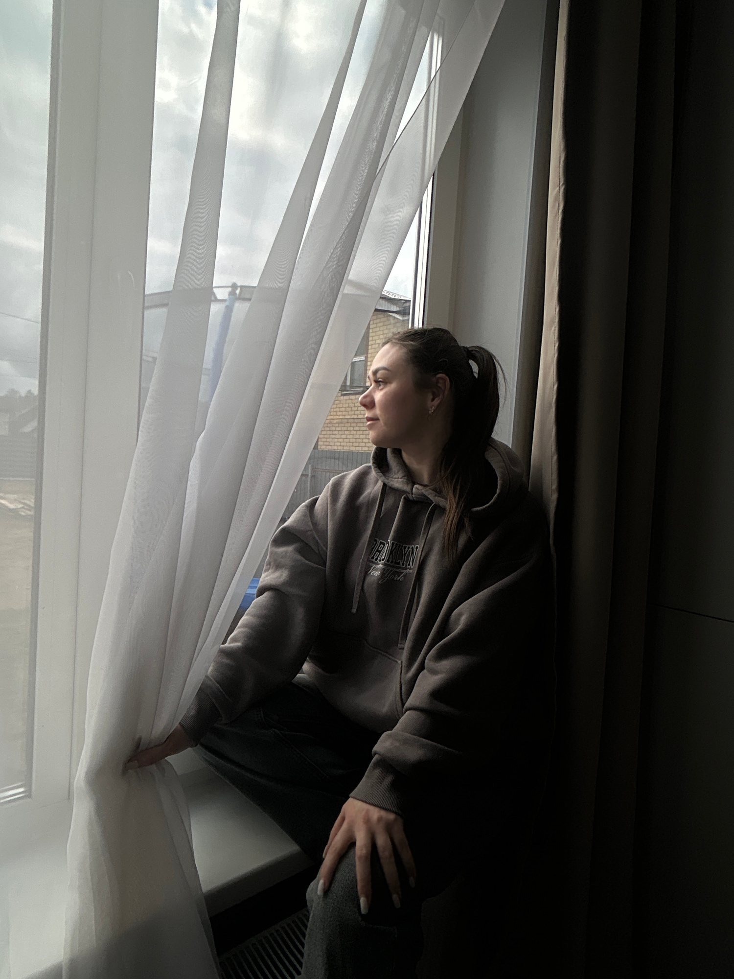 The image, initially rotated, depicts a young woman looking out a window from a dimly lit indoor setting. She appears to be in her late teens or early twenties, seen in profile with dark hair tied bac…read more