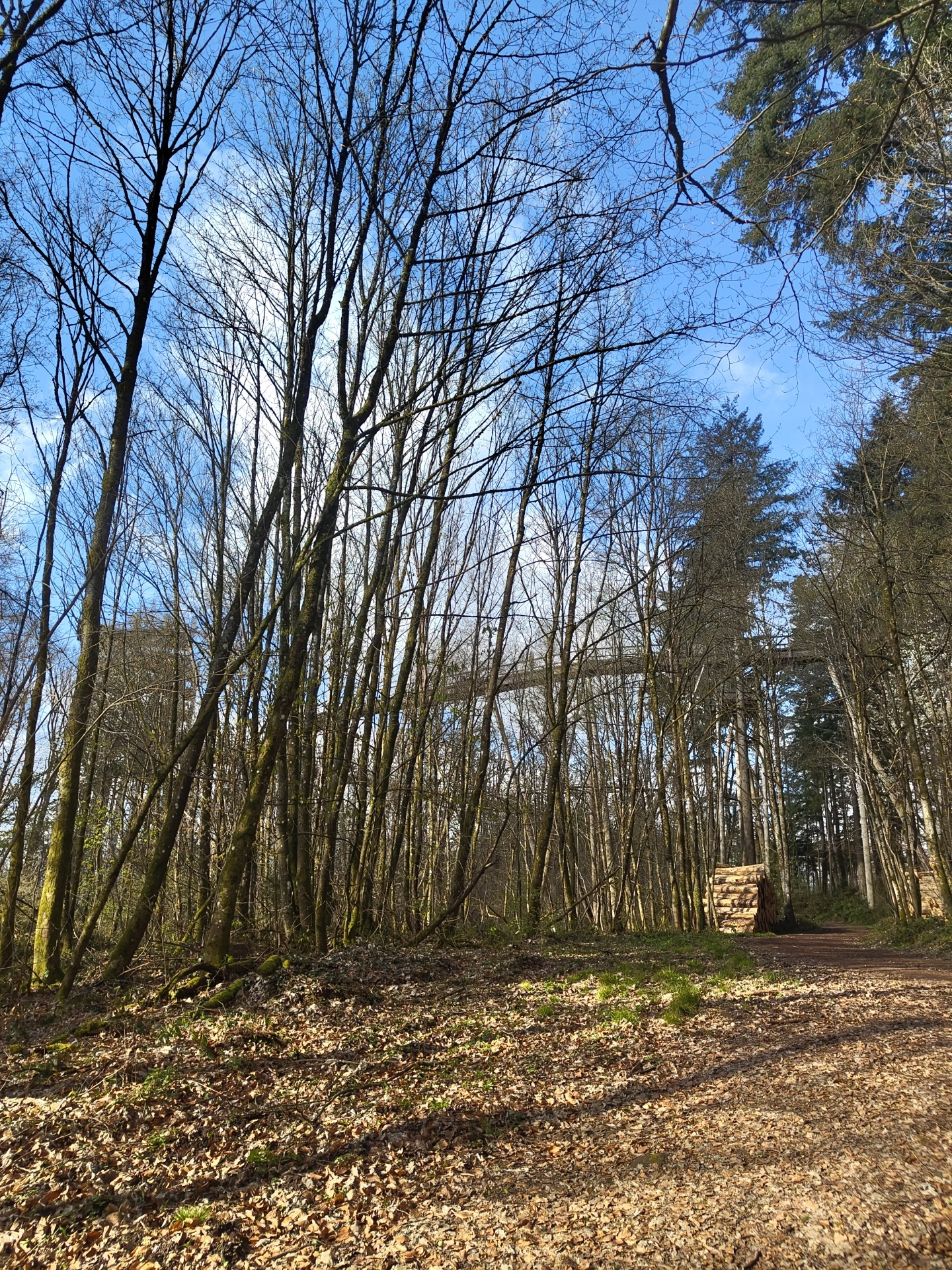 The image depicts a forest scene, likely in Mettlach, Germany. Trees with bare branches are prominent, their silhouettes reaching toward a blue sky with scattered clouds. The ground is covered in fall…read more