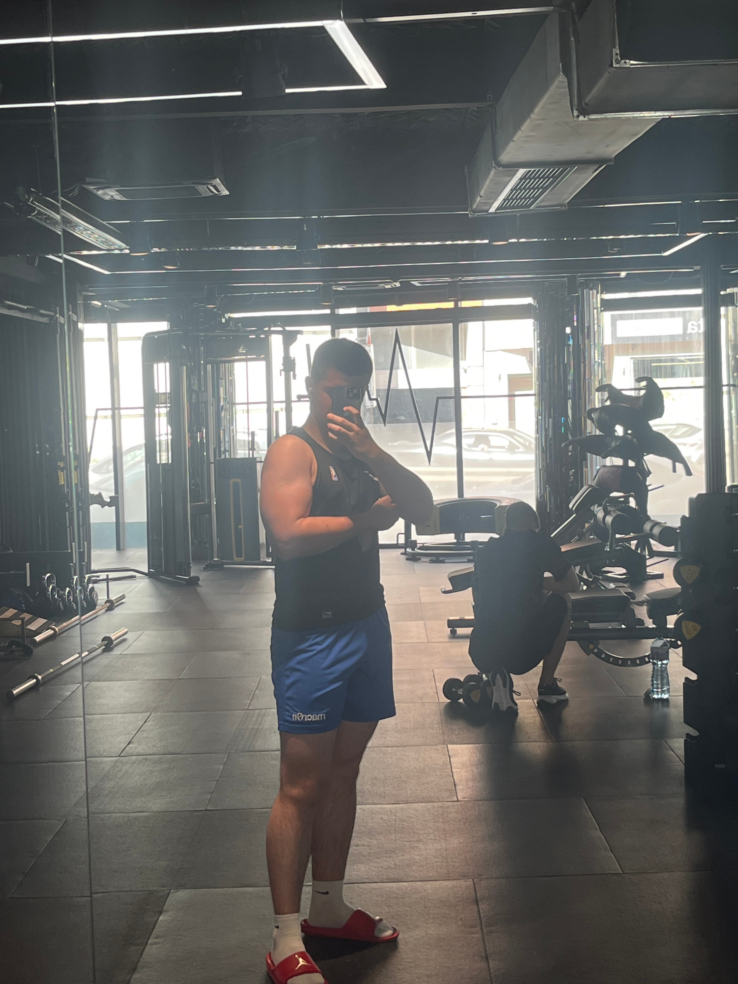 A man is captured in a mirror selfie within a brightly lit, modern gym. He stands upright, wearing a black tank top, blue shorts with the reversed text "UBCLAU" (likely "LUCLAU" when read correctly),…read more