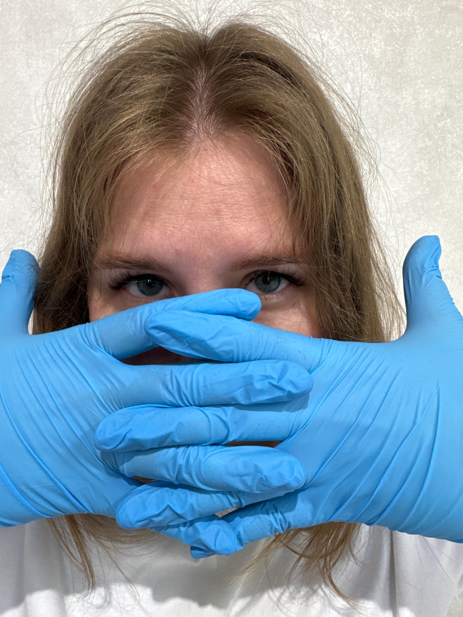 The image shows a fair-skinned individual with blonde hair, their face partially obscured by two hands covered in light blue surgical gloves. Only their eyes and a portion of their forehead are visibl…read more