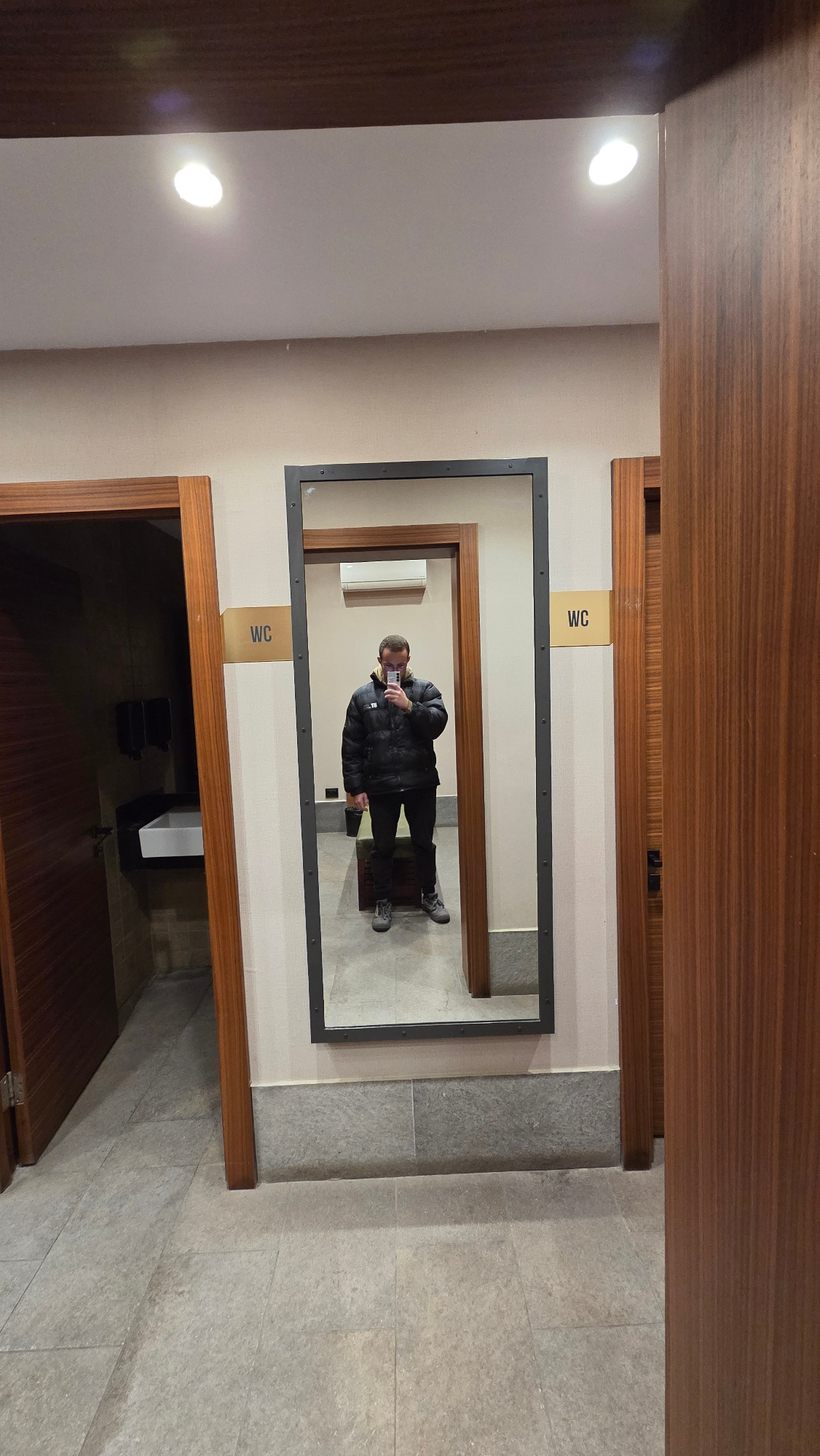 A full body reflection of a man taking a selfie is visible in a mirror in a public restroom. The man is wearing a black puffy coat and dark pants, with gray shoes. He is holding a smartphone up to tak…read more