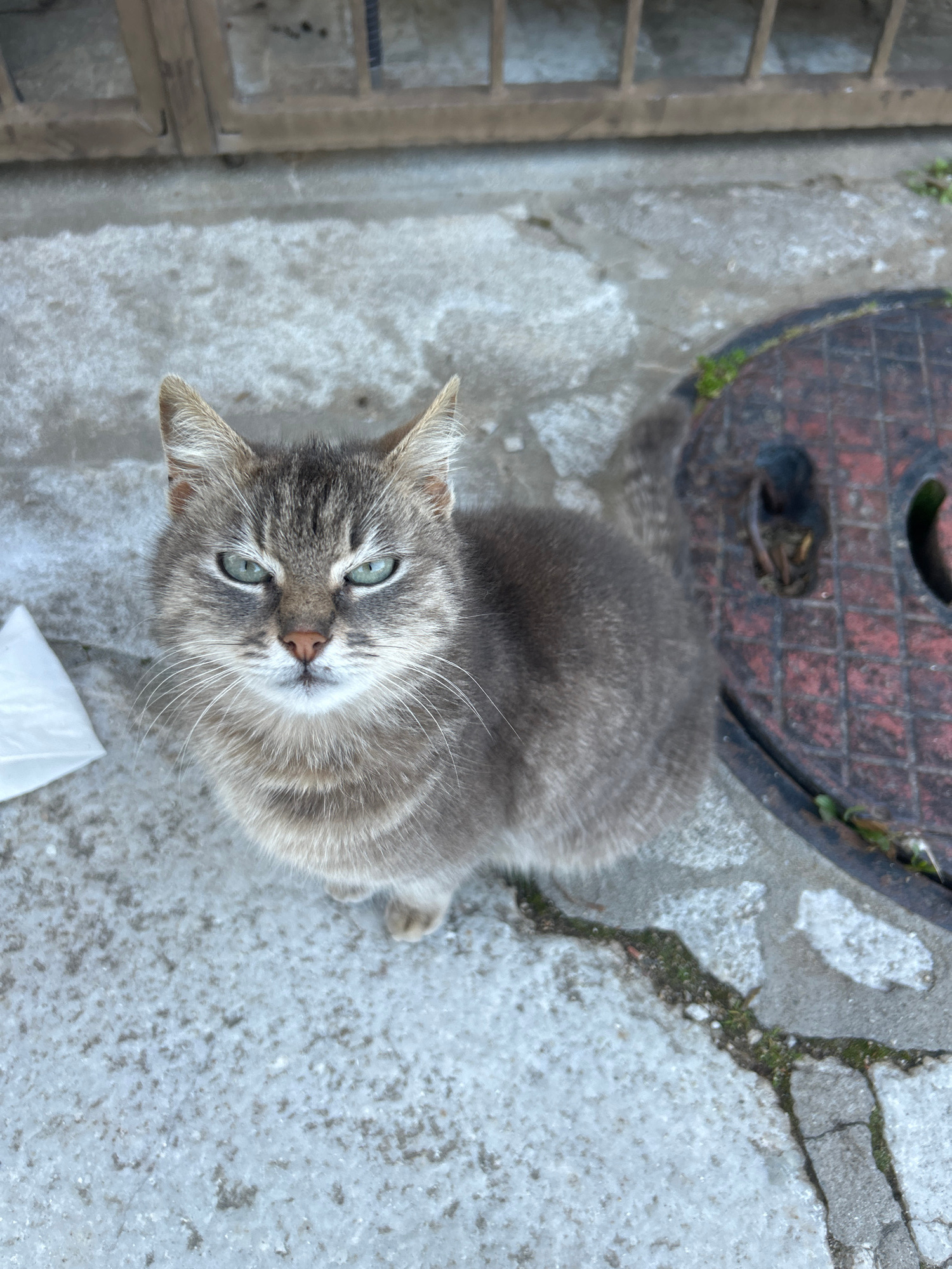 A gray tabby cat with green eyes looks up at the camera. It is sitting on a gray concrete surface with cracks and variations in texture. A circular manhole cover with a brick-like pattern is partially…read more