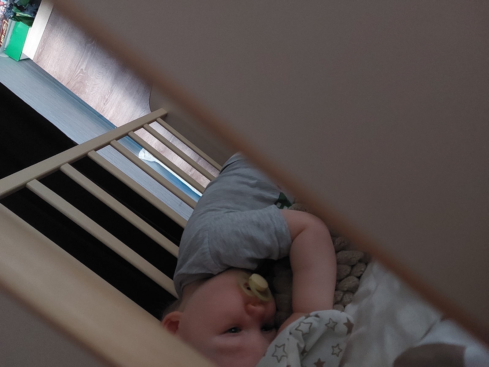 A baby wearing a gray shirt is lying in a crib with a pacifier in its mouth. A patterned blanket is partially covering the baby. The crib has wooden slats on one side. The floor and a box are visibleβ¦read more